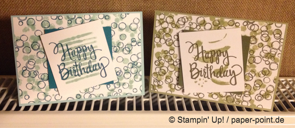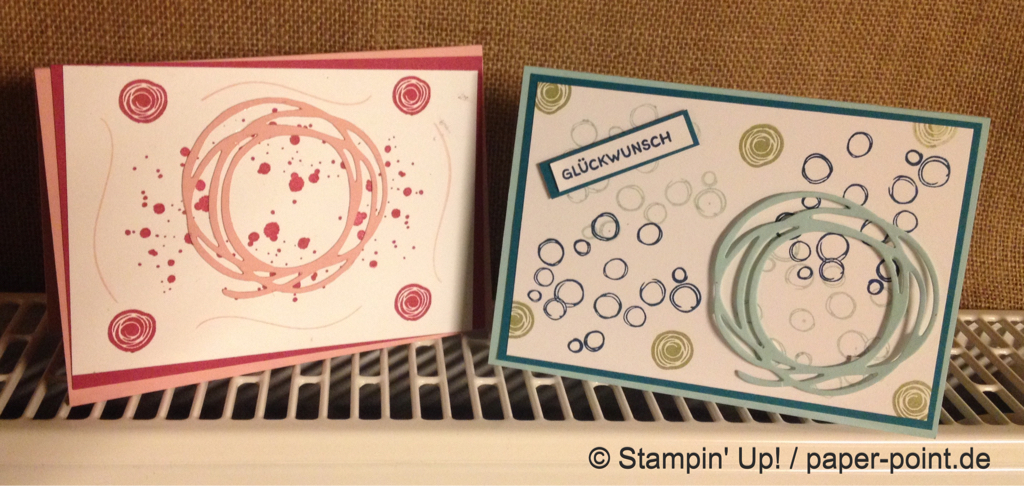 Mit den Stempelsets „Gut gesagt“ und „Bokeh Dots“ haben wir die erste Karte bestempelt. Die filigranen Akzente und Worte wurden mit den Framelits „Schön geschrieben“ ausgestanzt und vorsichtig auf die Karte geklebt. Mit den doppelseitigen Klebeblättern lässt sich das alles gut verarbeiten.Mit einem Fingerschwämmchen ist der Rand noch ein bisschen eingefärbt worden.