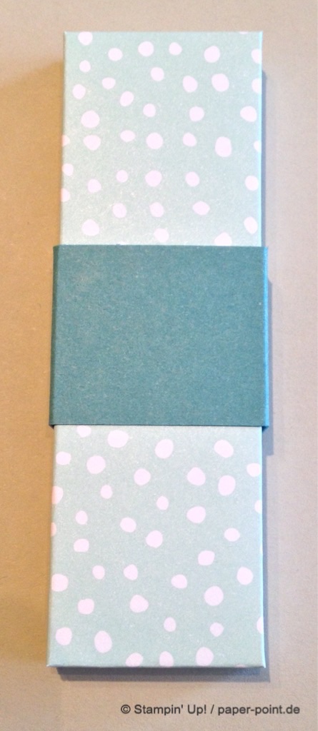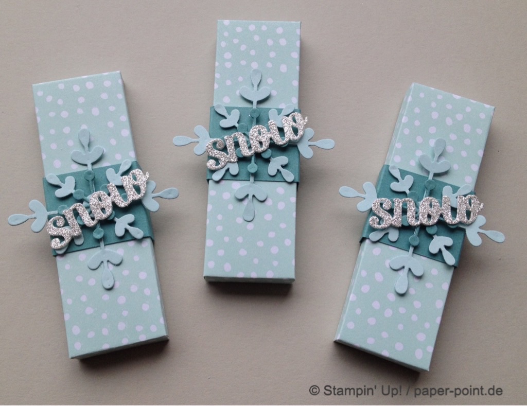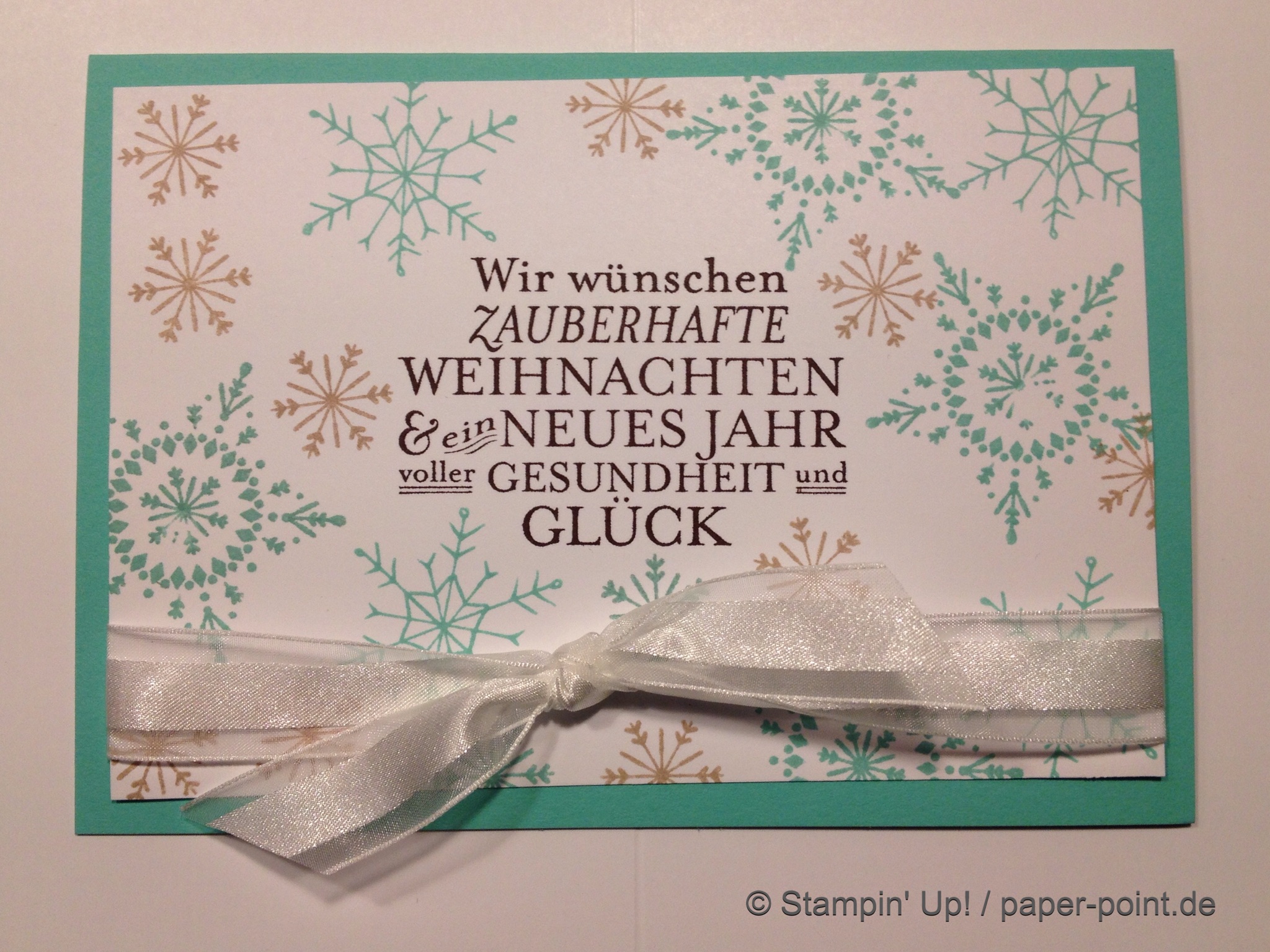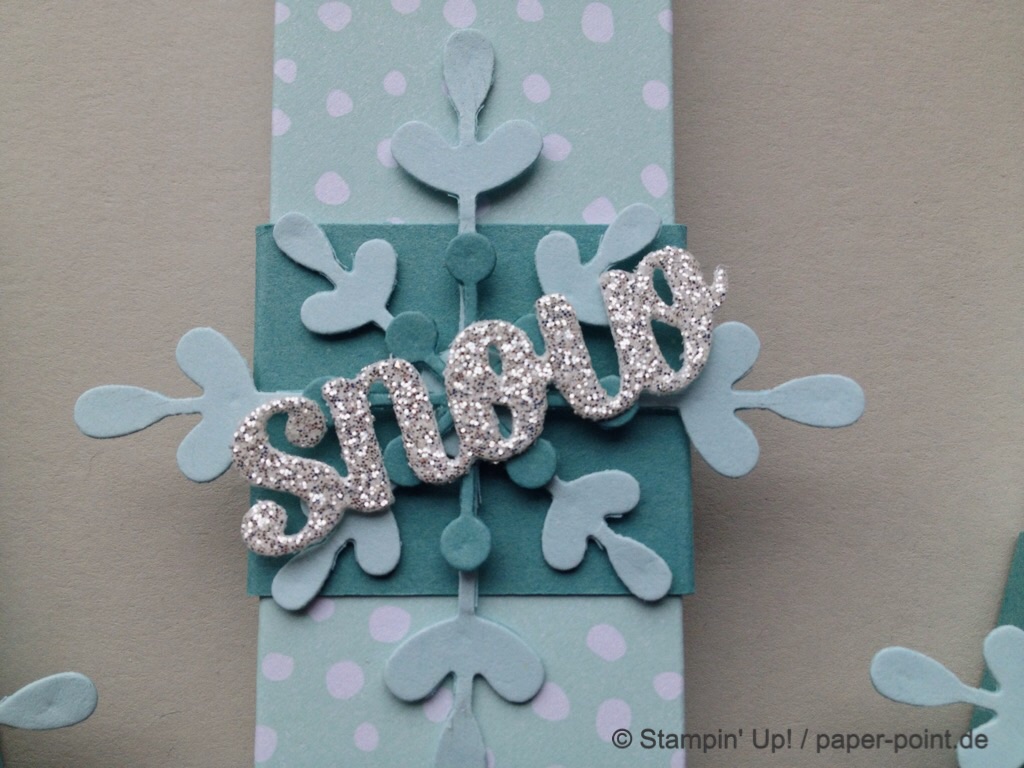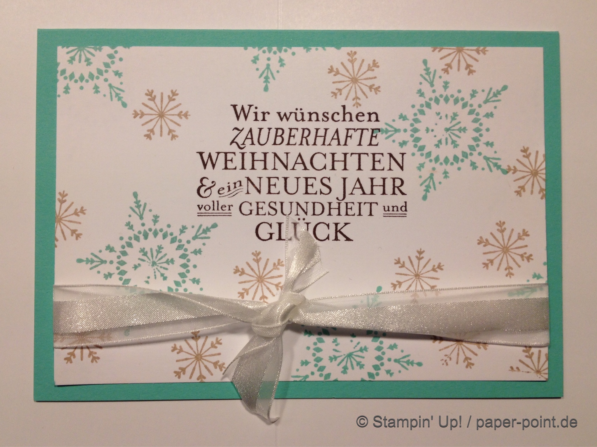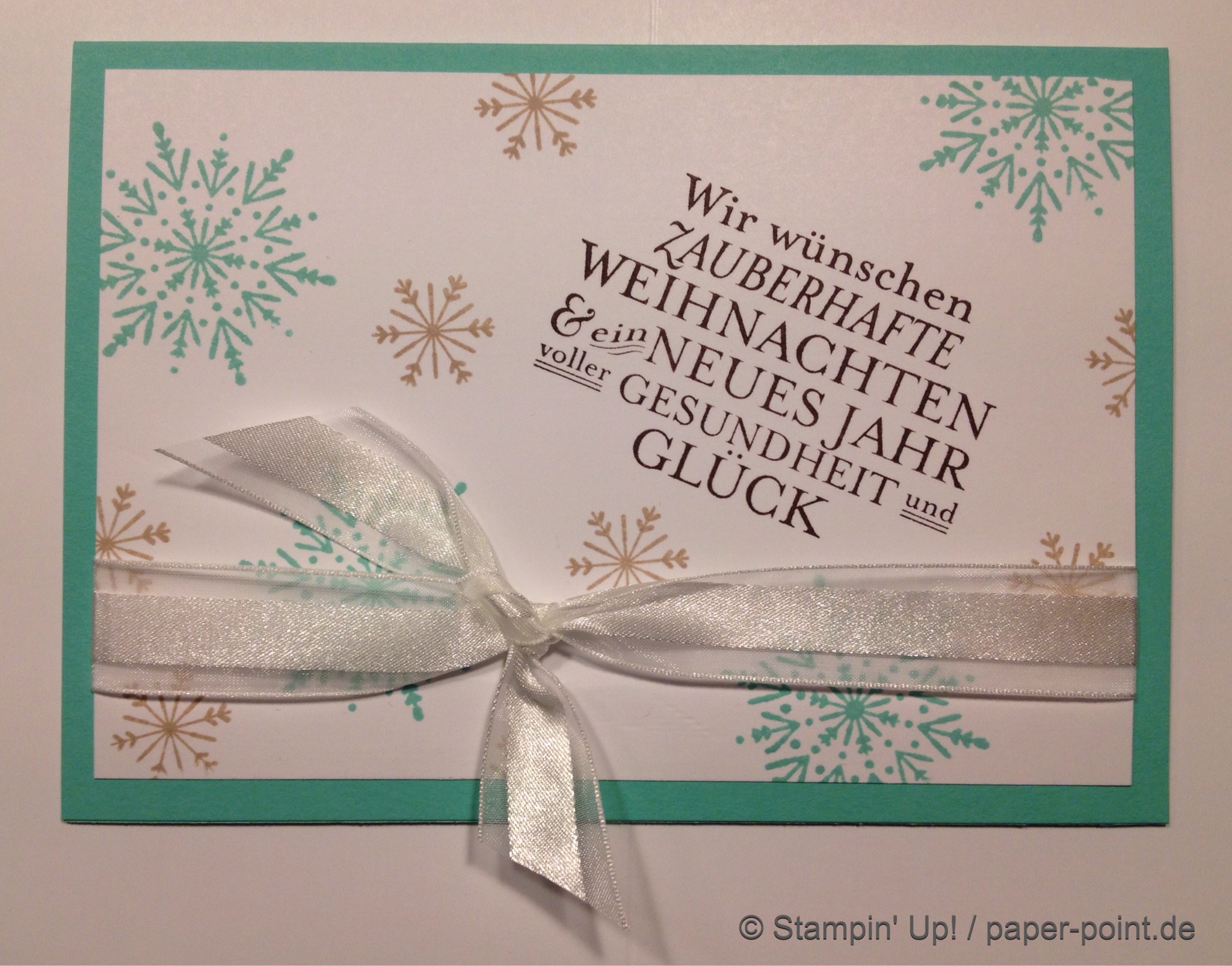 Den schönen Sternchenrand haben wir mit der Stanze Sternenkonfetti gestaltet. Der Weihnachtsanhänger-Stern ist aus „Many Merry Stars“. Und ich finde das seidige Taft-Geschenkband für die Schleife in Lagunenblau super toll 🙂