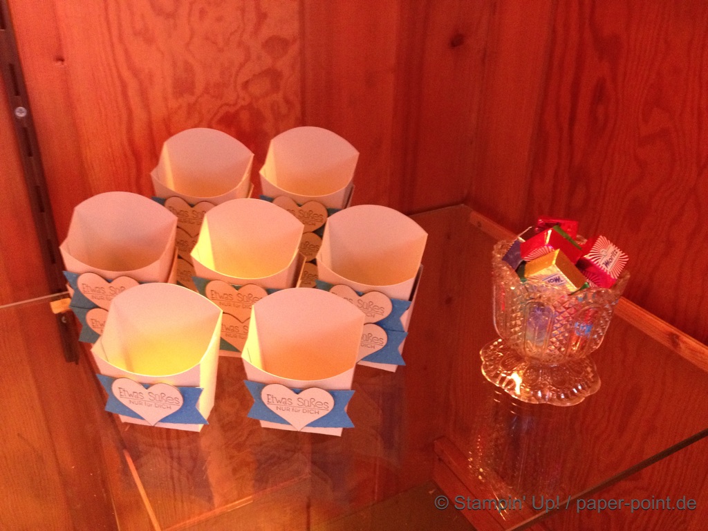 Für die Konfetti-Tüte habe ich mal wieder die „Thinlits Mini-Leckereientüte“ hervorgekramt und aus Farbkarton Pergament ausgestanzt. Ich hatte noch ein Stückchen von dem Designerpapier übrig (Bastler haben ja keinen Abfall, nur Reste 😉 ), das klebt nun als Hintergrund auf der Tüte.