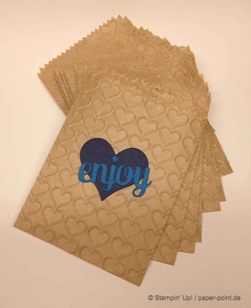 Zum Glück besitzt mein Stanzen-Fundus die tolle Konfetti-Stanze. In den passenden Farben und in Glitzerkarton Silber habe ich Konfetti ausgestanzt und in die Tüte gefüllt.