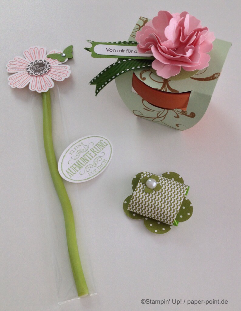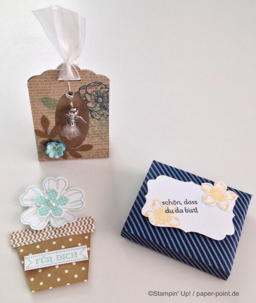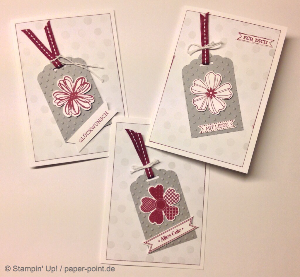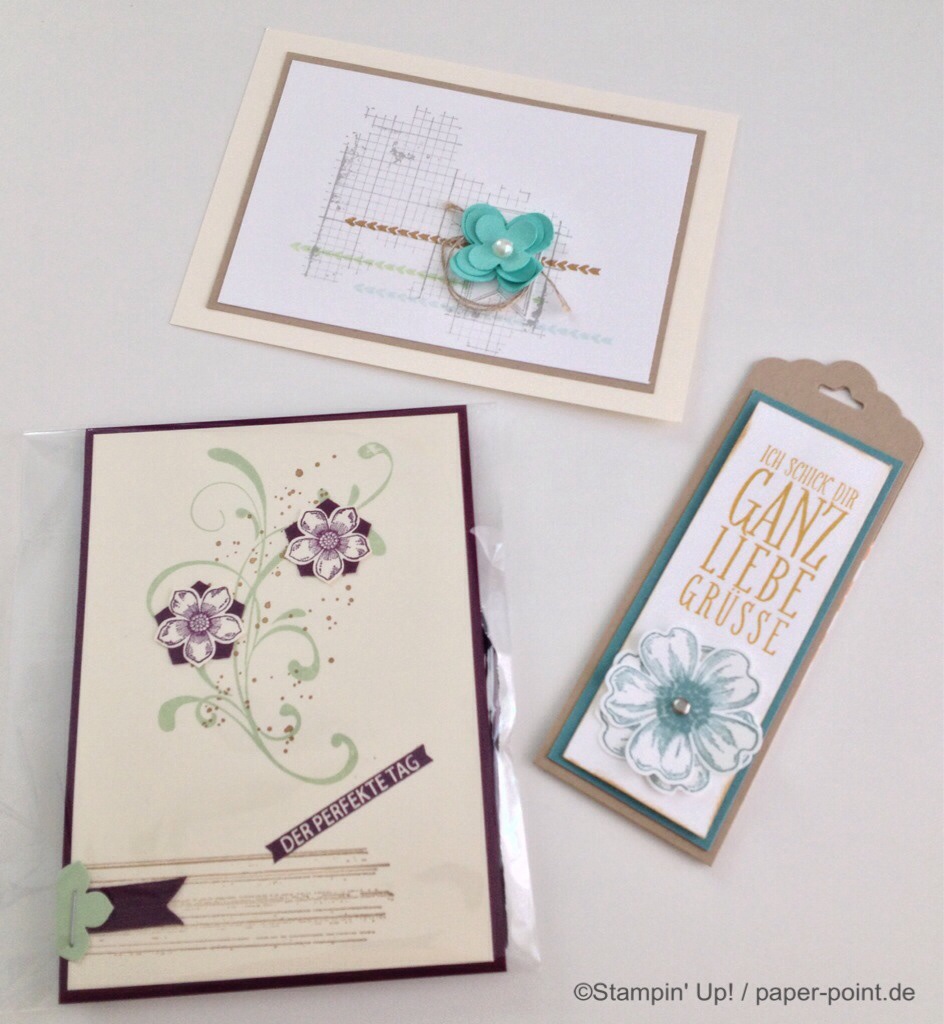 Wir haben die verschiedenen InColors 2014-2016 und das passende Designerpapier verwendet. Die Blume haben wir aus „Mixed Bunch“ ausgewählt.