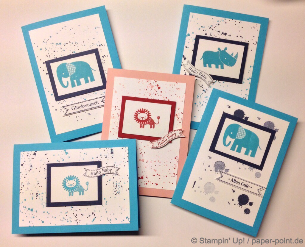Nachdem ich den „Neulingen“ kurz die Vorgehensweise mit den Stempeln und den Stempelkissen erklärt hatte, ging es auch gleich los! Von einer Teilnehmerin wurde vorab bei mir eine Babykarte gewünscht. So einen süßen Wunsch setze ich doch gerne in die Tat um. Es durfte zwischen Türkis/Marineblau und Kirschblüte/Chili ausgewählt werden. Und das ist dabei rausgekommen: