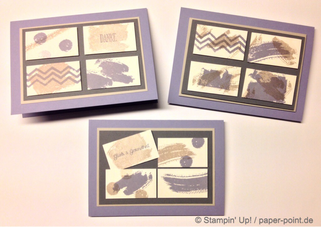 Dann ging es weiter mit unseren Kunstwerken. Mit dem Stempelset „Work of Art“ haben wir vier Kärtchen bestempelt und mit anthrazitgrauem Hintergrundkarton auf eine passende Karte geklebt.