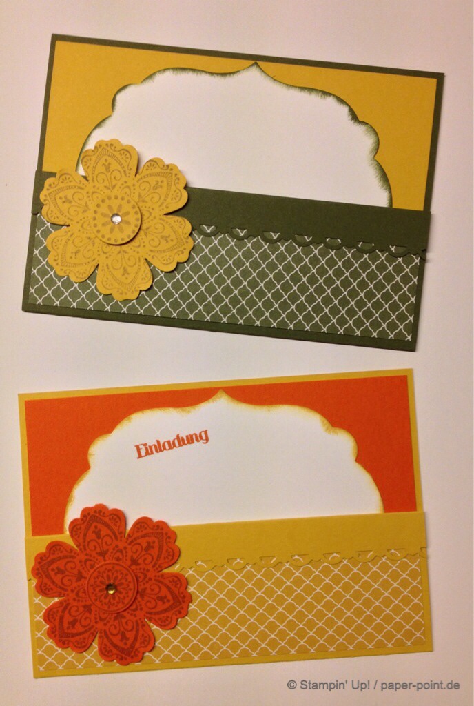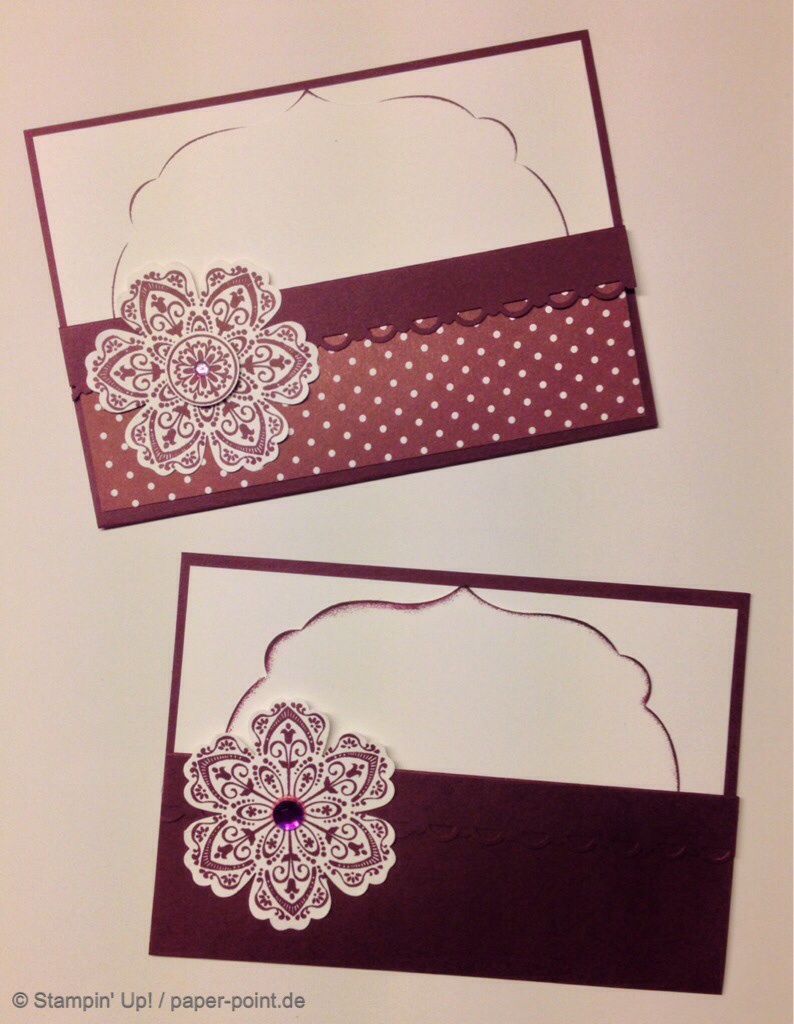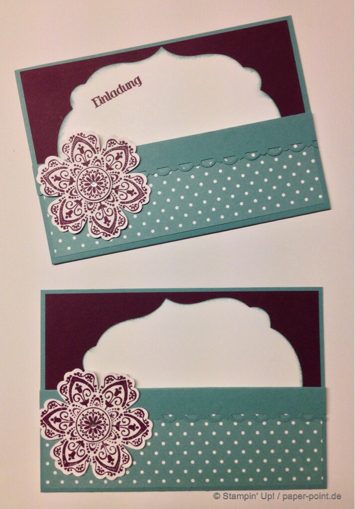 Und zum Abschluss war noch mal eine Einladungskarte gewünscht. Hier haben wir eine Hülle gebastelt, in die wir einen Einleger (ausgestanzt mit den Framelits Rahmen-Kollektion, 2. Größe) reingesteckt haben. Den Rand haben wir mit einem Schwämmchen eingefärbt oder in das Stempelkissen gedrückt. Dieser Einleger kann mit den Daten der Feier beschriftet werden. Man kann daraus auch einen Gutschein oder eine Glückwunschkarte für viele Anlässe machen.
