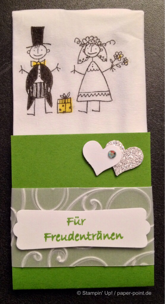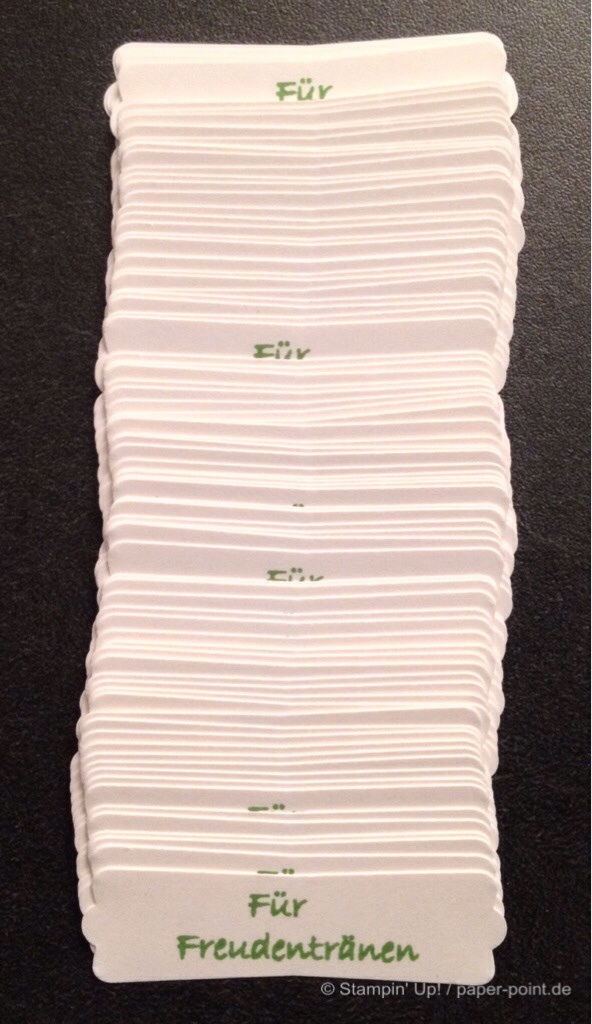 imageDavon haben wir 80 Stück gebastelt, damit auch jeder Hochzeitsgast seine Freudentränchen abwischen kann. Ich hoffe, dass ich dem Brautpaar und den Gästen damit eine Freude machen konnte und dass die Taschentücher auch benutzt werden. Ich werde bestimmt zu hören bekommen, dass die viel zu schade zum Tränen abwischen sind… 😀 Egal! Jetzt wird erst mal gefeiert!