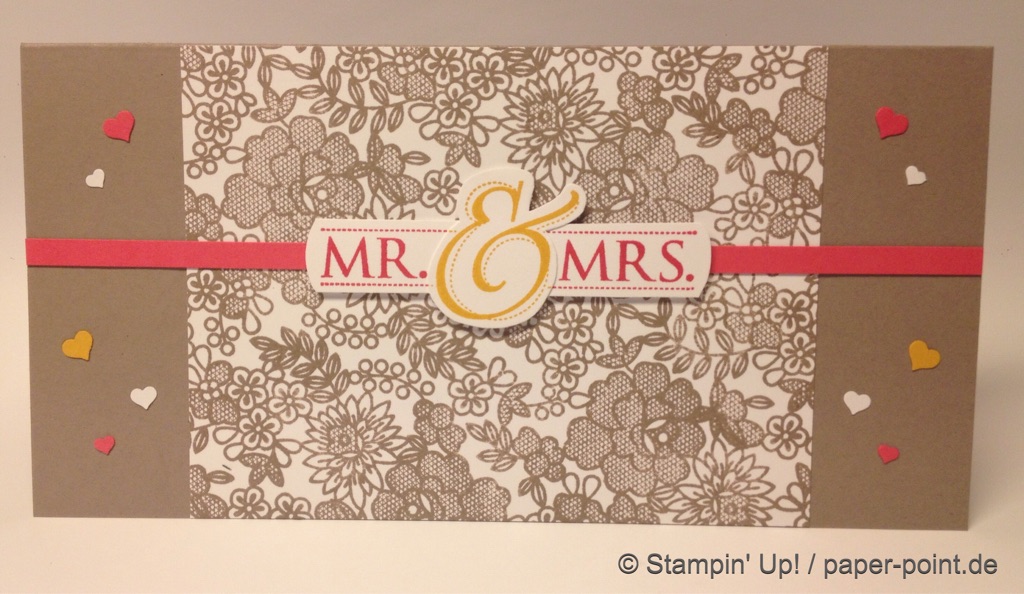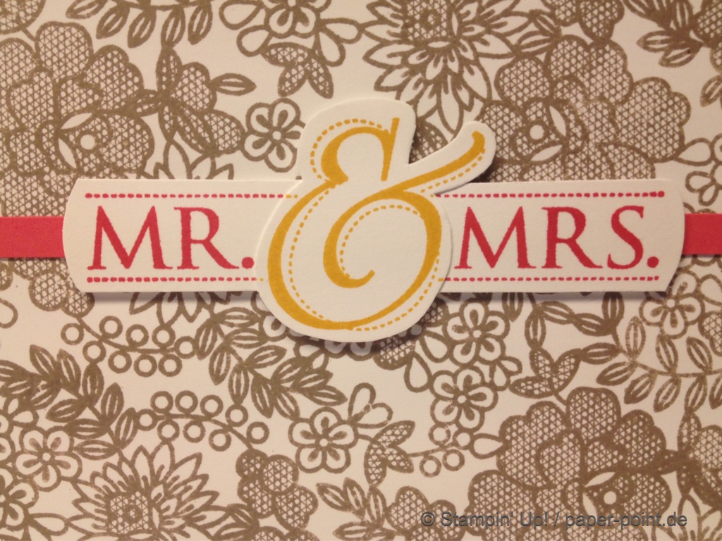 Auch hier habe ich den Mr.&Mrs. Stempel in zwei Farben übereinander geklebt und am Rand eine schöne Wellenbordüre angebracht: