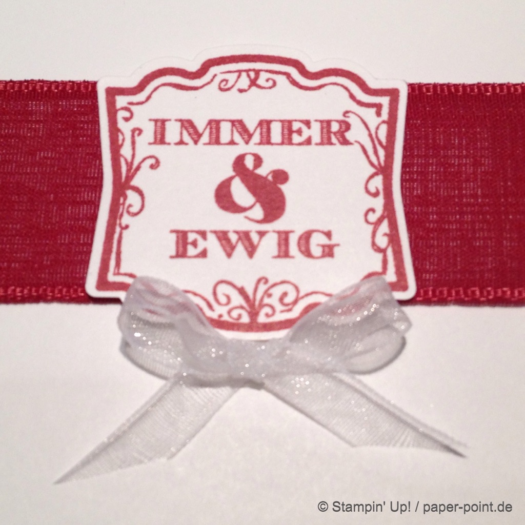 Als kleines Spruch-Etikett habe ich zu den „Nett-iketten“ gegriffen und mit der passenden Stanze „Designeretikett“ ausgestanzt sowie mit rotem Farbkarton hinterlegt. Hierfür wird die Form ein weiteres mal ausgestanzt, in der Mitte durchgeschnitten und versetzt hinter das Etikett geklebt.