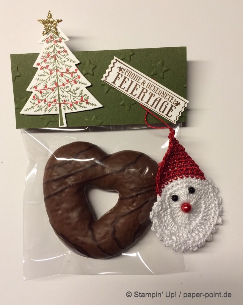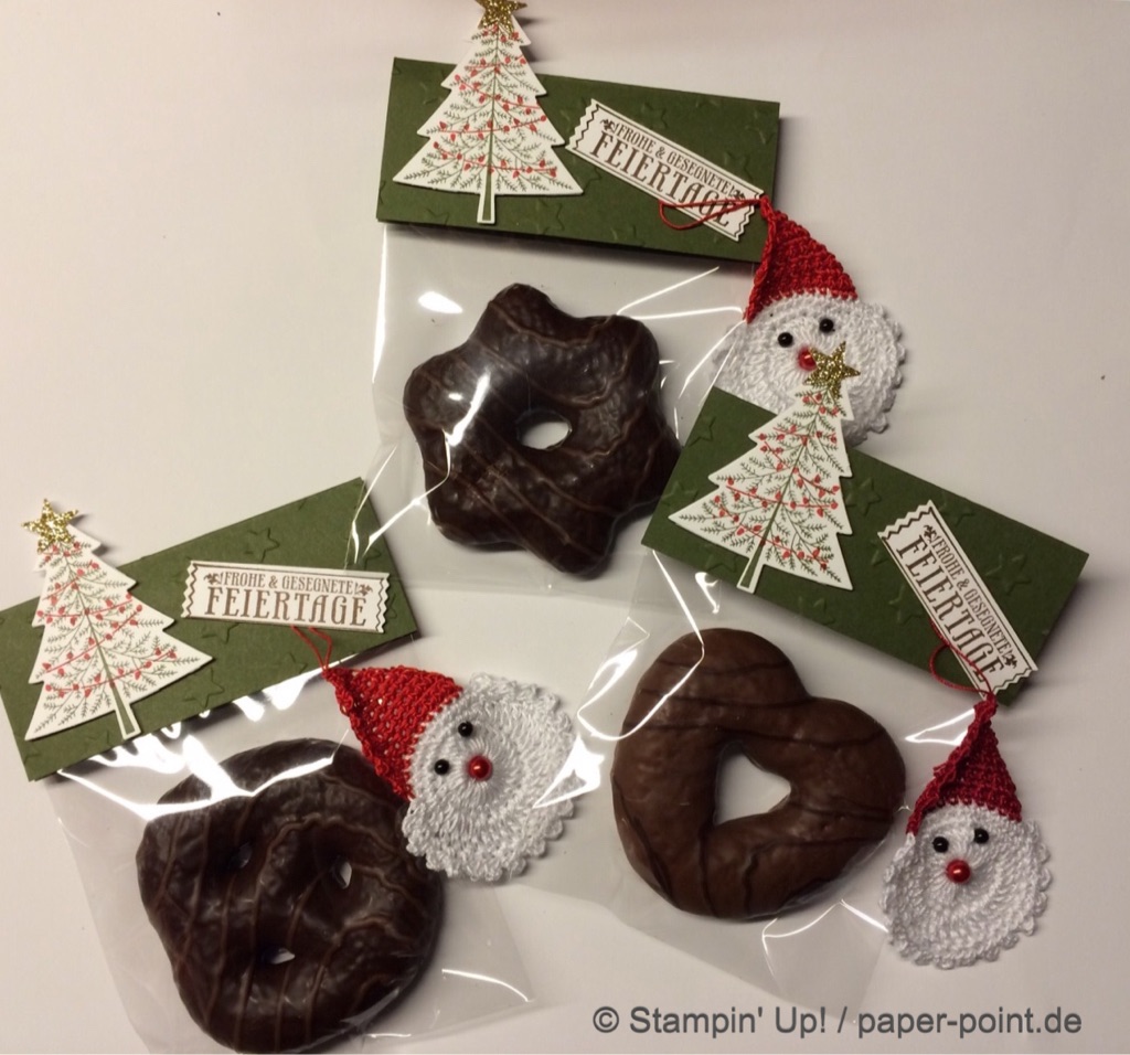 Leckere Schokolebkuchen wurden verpackt und mit grünem Farbkarton, den wir mit Sternchen geprägt haben, verschlossen, anschließend mit einem süßen Tannenbäumchen und Weihnachtsgrüßen verziert und der obligatorische Nikolaus dran gehängt (alle selbst gehäkelt von der 96-jährigen (!) Uroma!).