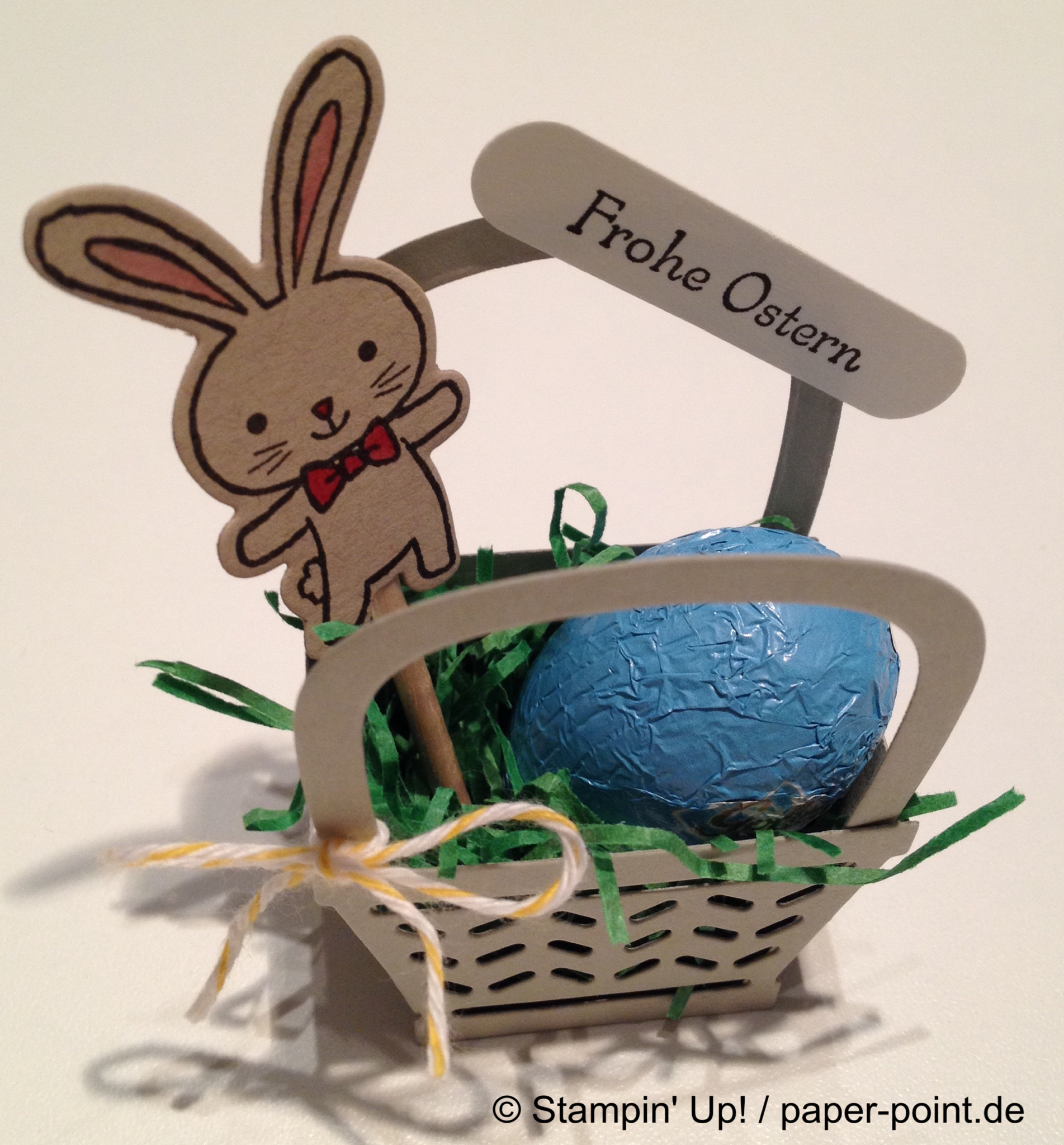Den Hasen aufstempeln, ausmalen und auf den Wellenkreis kleben, anschließend auf der Vorderseite mit einem Klebepad befestigen.