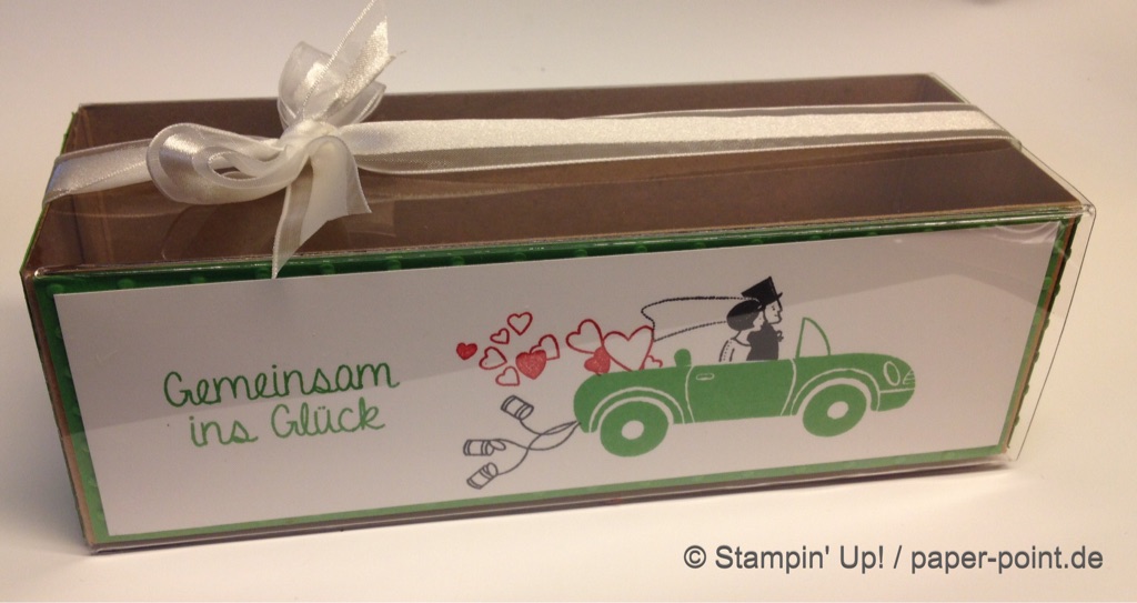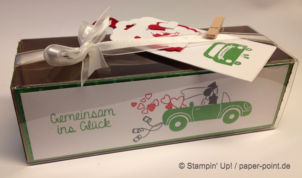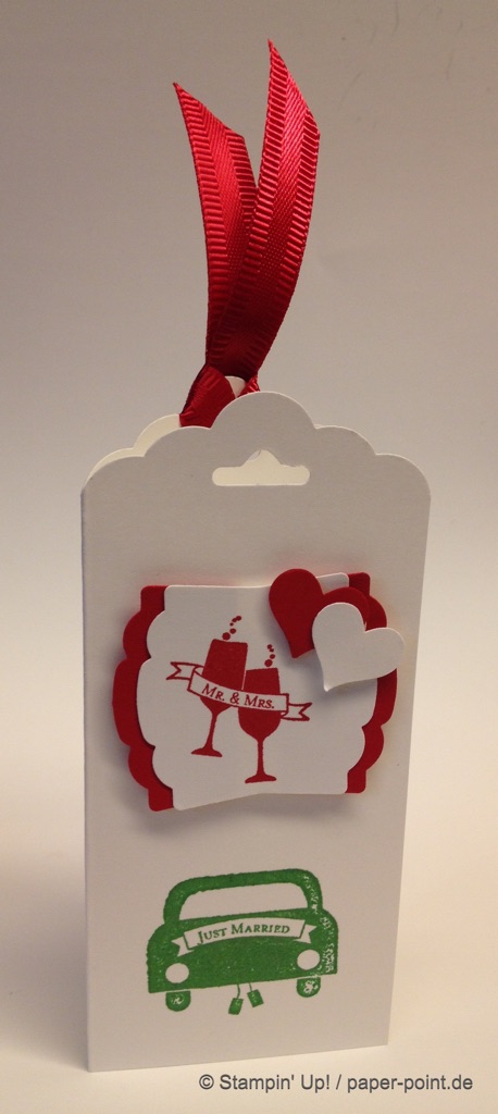 Das Stempelset „Perfekter Tag“ beinhaltet diesen schönen Textstempel, den ich mit dem „Edlen Etikett“ ausgestanzt habe. Für den chili-farbenen Rand habe ich ein zweites Etikett ausgestanzt, die oberen und unteren Spitzen abgeschnitten, dann halbiert und dahinter geklebt.