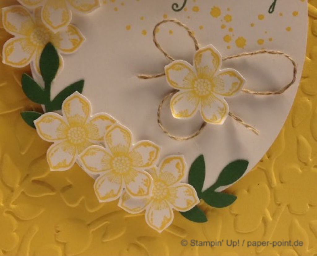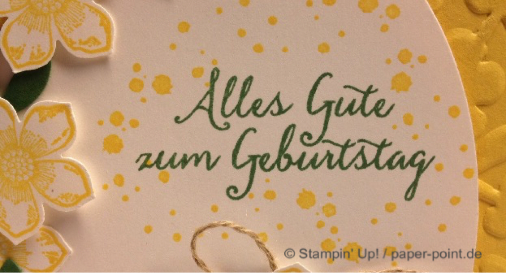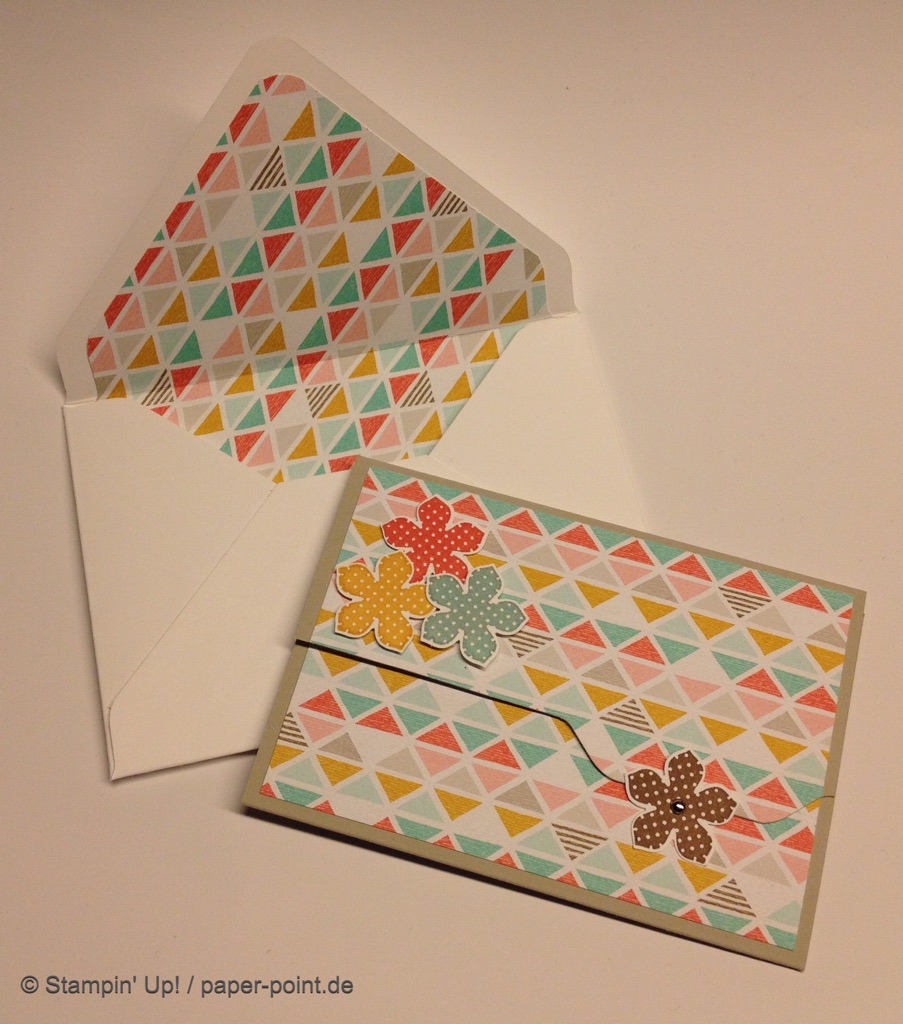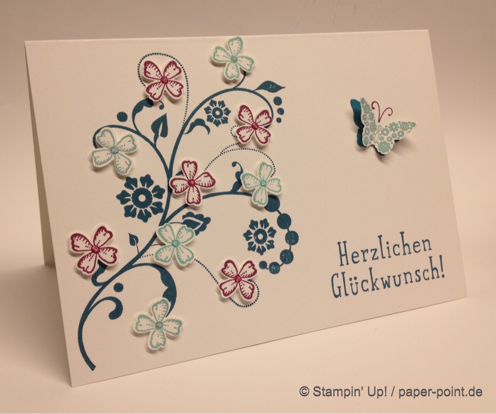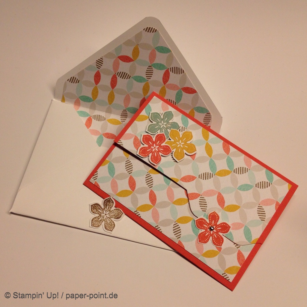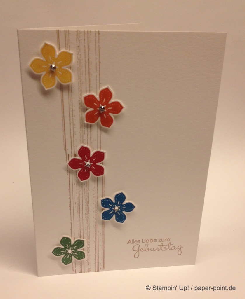 Bei der dritten Karte haben wir das Umschlagpapier in den aktuellen InColor-Farben auf die Karten geklebt, darauf ein Stück Flüsterweiß bekleckselt. Die Blüten und das Banner wurden ausgestanzt und dekorativ aufgeklebt.