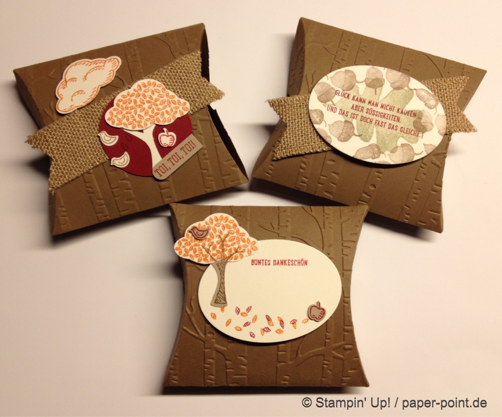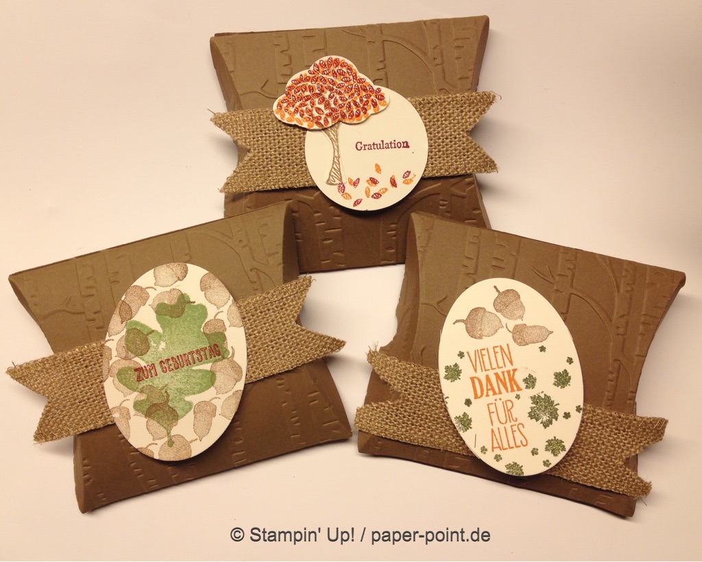 Danach haben wir eine Pillowbox (Kissenbox) mit der Thinlits Form ausgestanzt, mit dem Prägefolder „Im Wald“ geprägt und etwas herbstlich verziert: