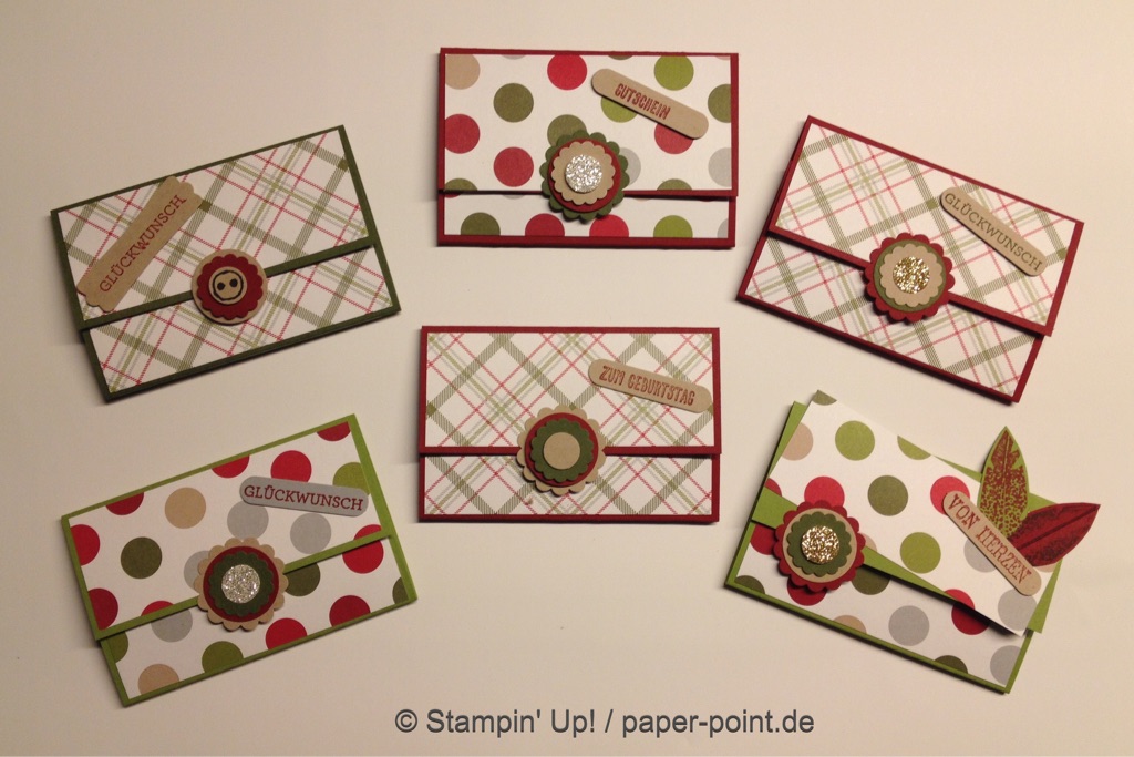 Verziert haben wir mit dem Designerpapier im Block Fröhliche Feiertage sowie einem Schildchen, das mit dem Wortfenster ausgestanzt wurde. Der Verschluss besteht aus verschieden großen Kreisen und Wellenkreisen, der mit einem Klett die Karte verschließt.