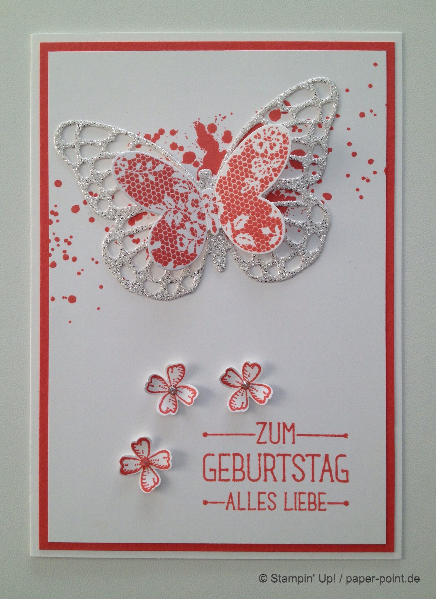 Für den unteren Kartenrand habe ich noch das Stempelset „Schmetterlingsgruß“ verwendet. Der schräge Streifen wurde direkt aufgestempelt, den kleinen Schmetterling habe ich gestempelt, ausgestanzt und nur in der Mitte befestigt, damit die Flügel nach oben gebogen werden konnten. Als Köpfchen habe ich einen mittelgroßen Glitzerstein verwendet.