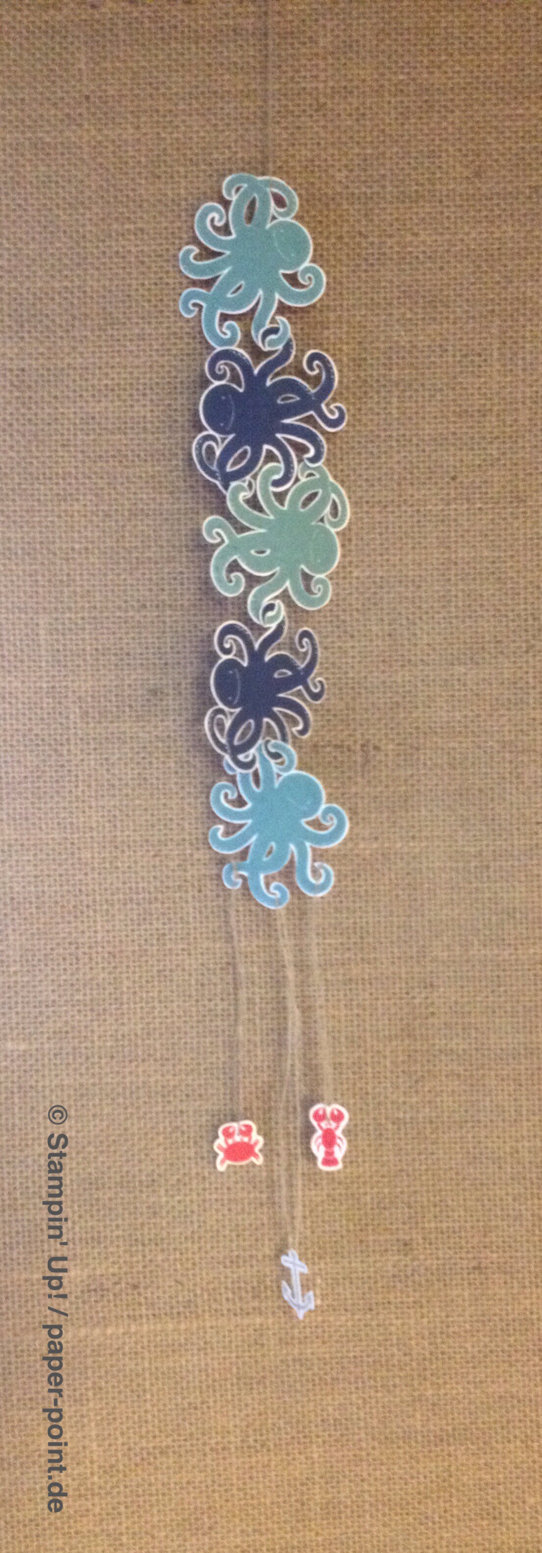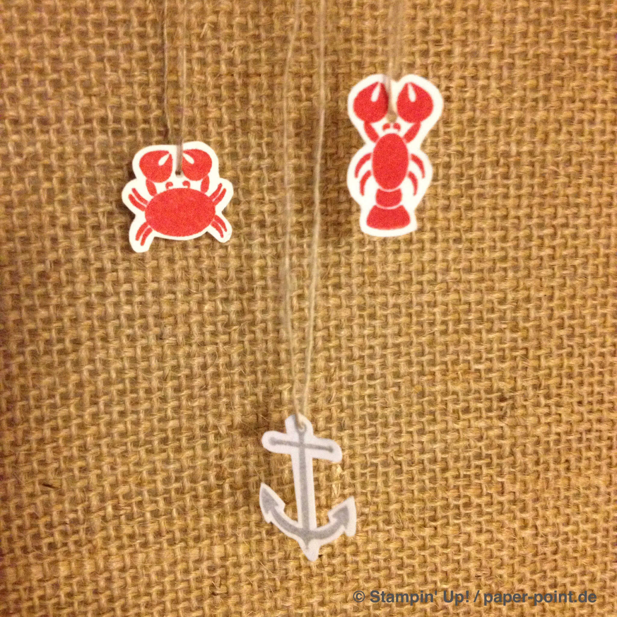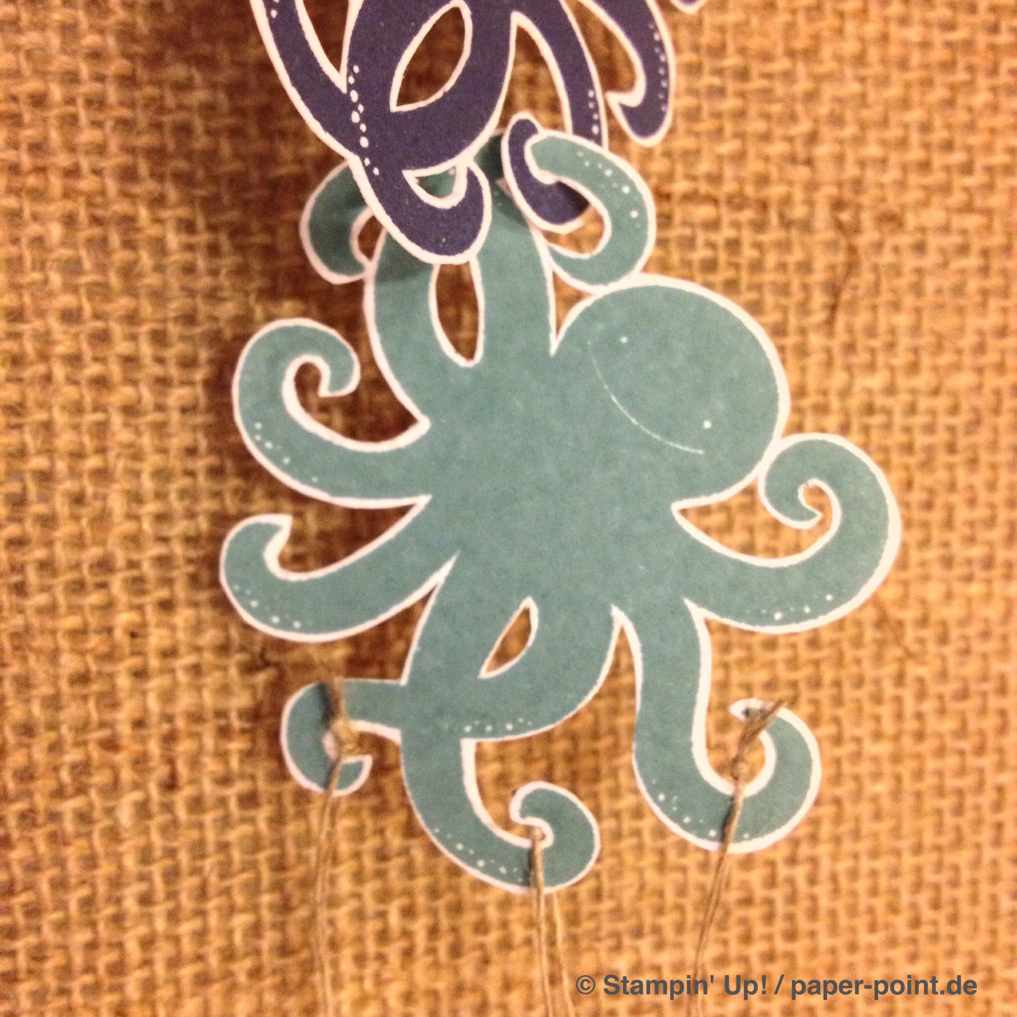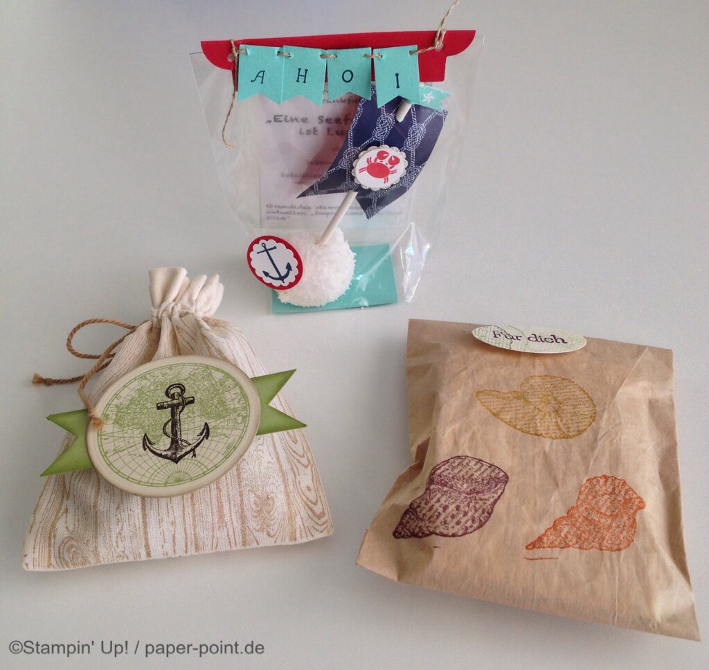 Und nun zur „Füllung“. Ich habe kleine Kaustreifen mit einem vorher bestempelten Fähnchen (Fähnchenstanze) verziert, bei dem ich noch ein Stück Leinenfaden mit reingetackert habe. Diesen Leinenfaden einfach zu einer Schleife binden – voilà, fertig!