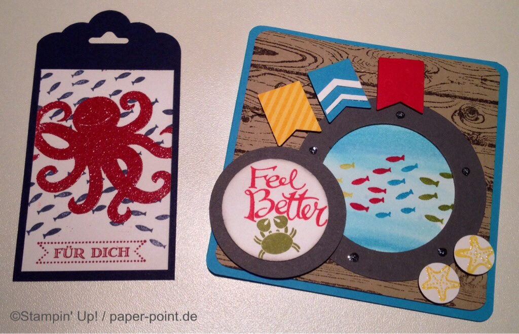 Man benötigt ein Stück Farbkarton (8,5 x 9,9 cm) in Flüsterweiß und bestempelt es mit dem Stempelset „Sea Street“ in den Farben Jade, Marineblau und Glutrot: