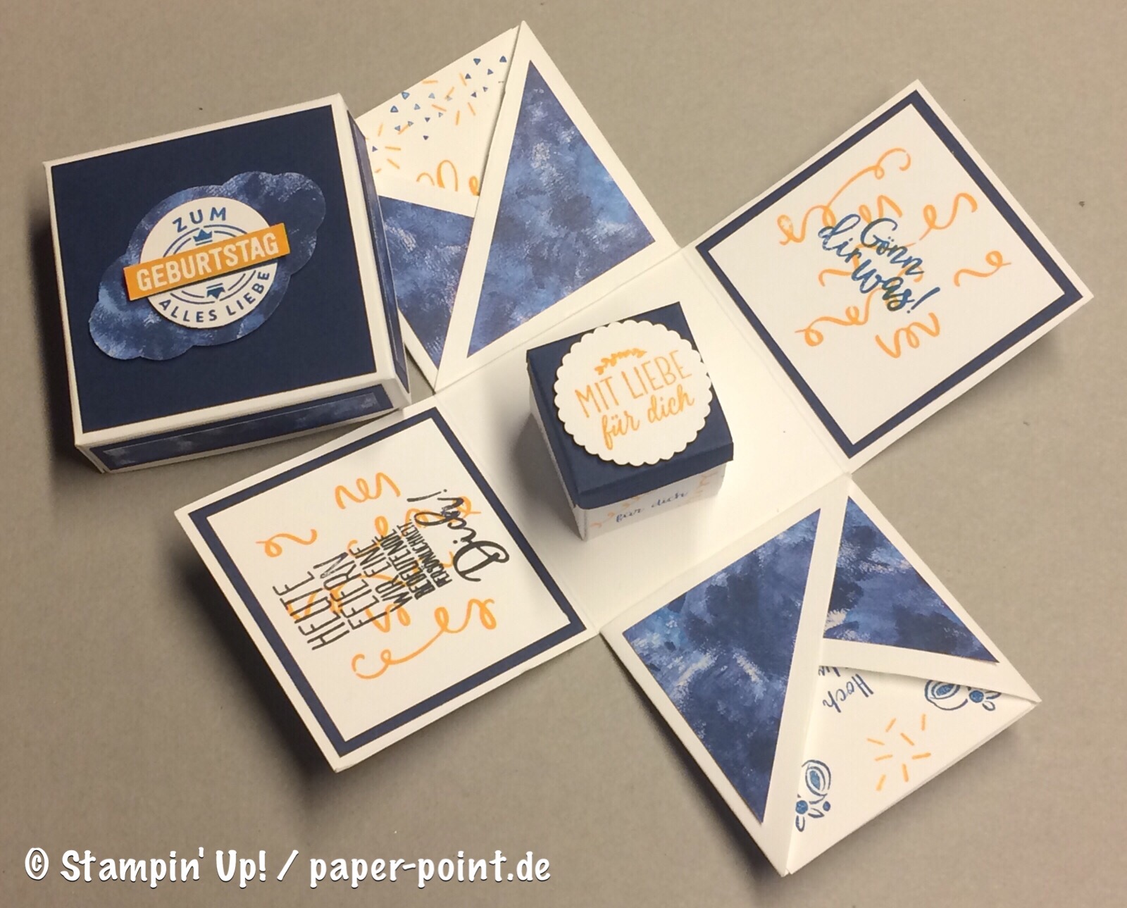 Auf den beiden vorderen Teilen klebt Farbkarton in der Größe 11 x 10 cm und 3,5 x 10 cm. Das Designerpapier „Traum vom Meer“ haben wir auf die Größe 10,5 x 9,5 cm und 3 x 9,5 cm zugeschnitten und aufgeklebt.