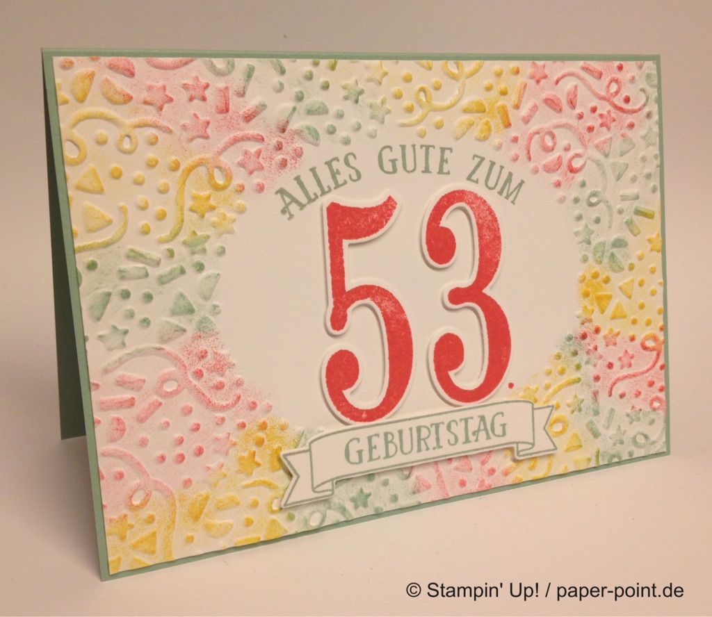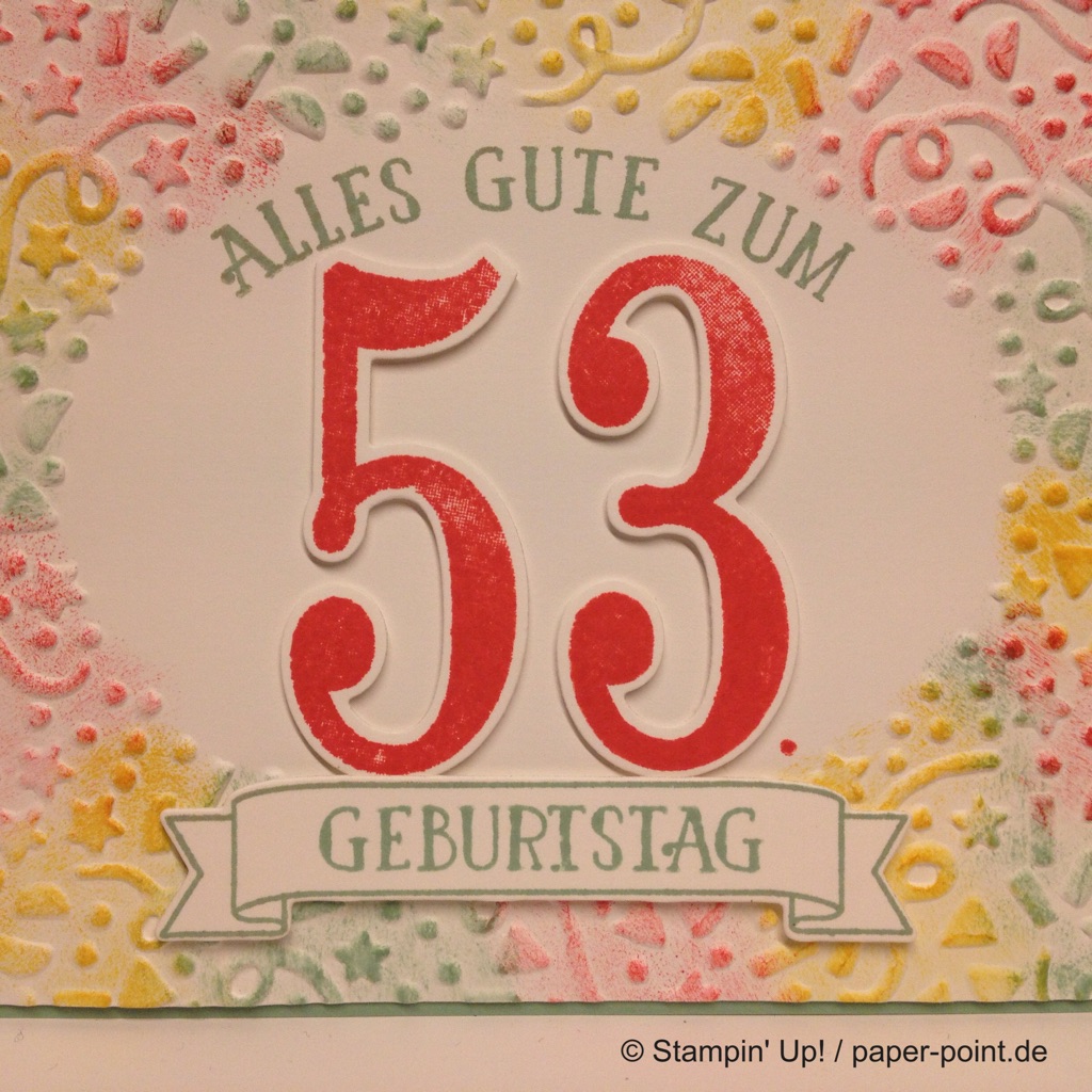 Die Fähnchen der kleinen Girlande habe ich mit einem Framelit aus „Große Zahlen“ ausgestanzt und mit dem Rahmen aus „So viele Jahre“ bestempelt. Den Leinenfaden habe ich durch kleine Löcher gefädelt, die ich zuvor mit einer Nadel reingepiekst habe.