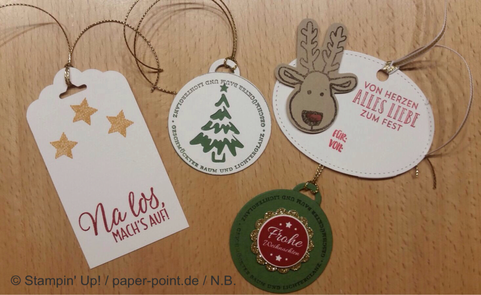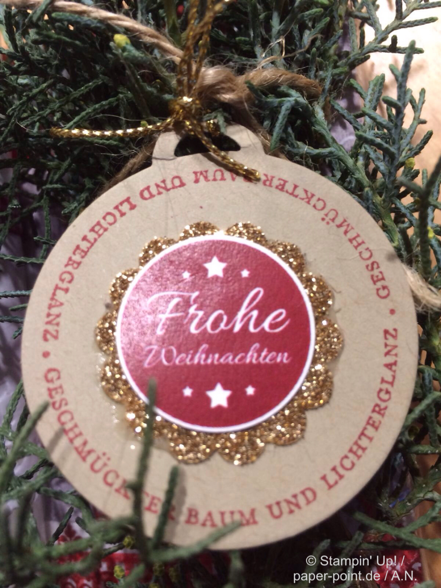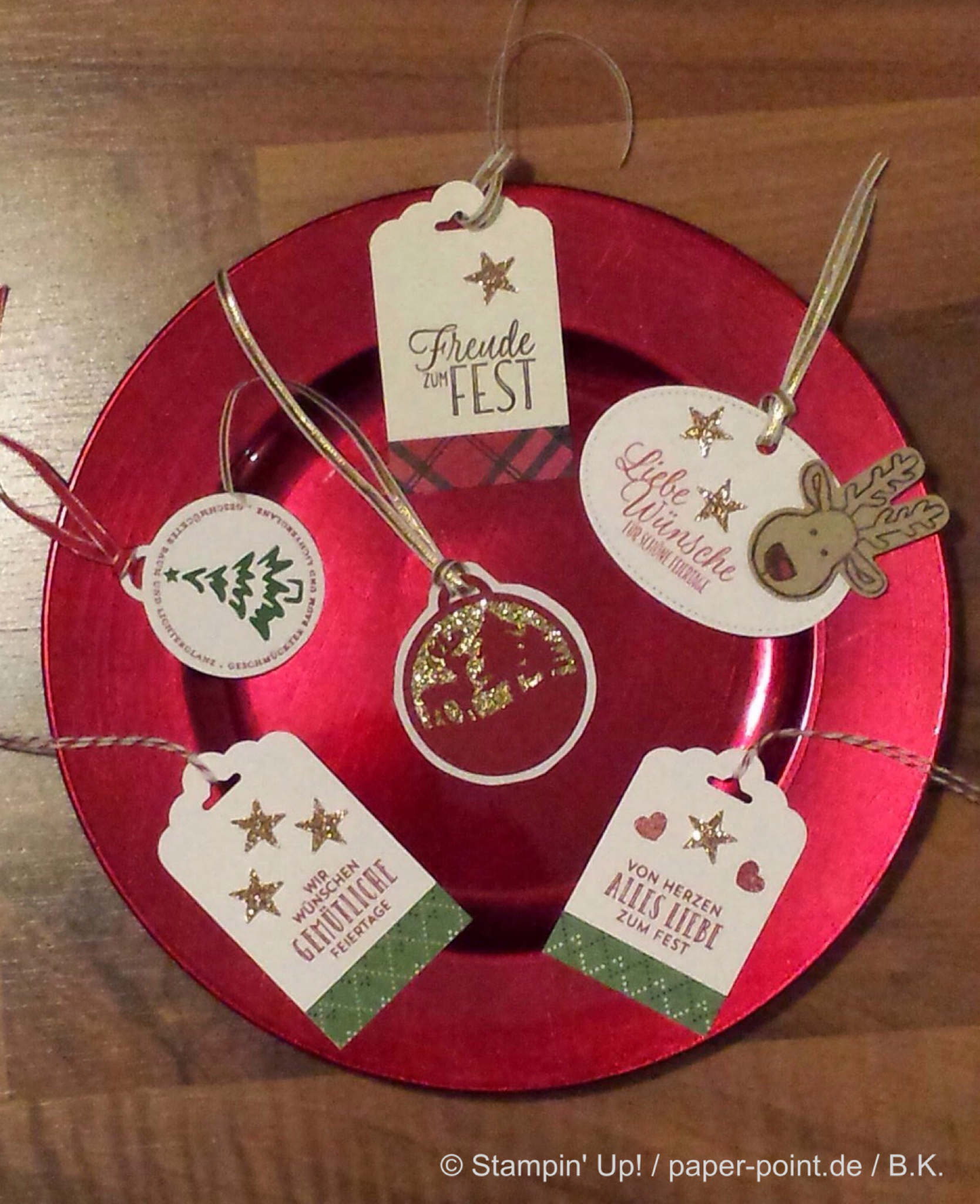 Ein kleiner Spruch aus „Klitzekleine Grüße“, ausgestanzt mit dem „Klassischen Etikett“, vollendete unsere Anhänger.