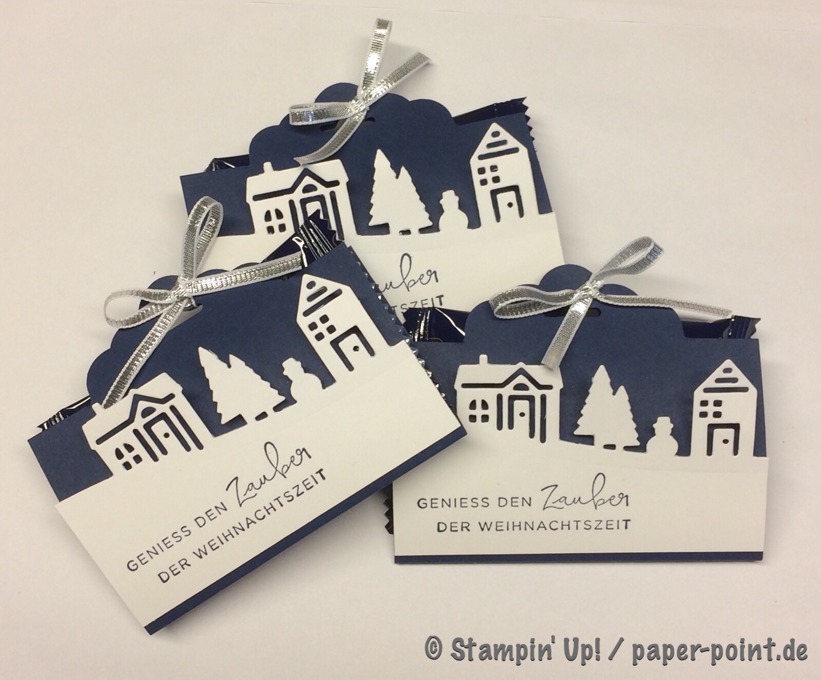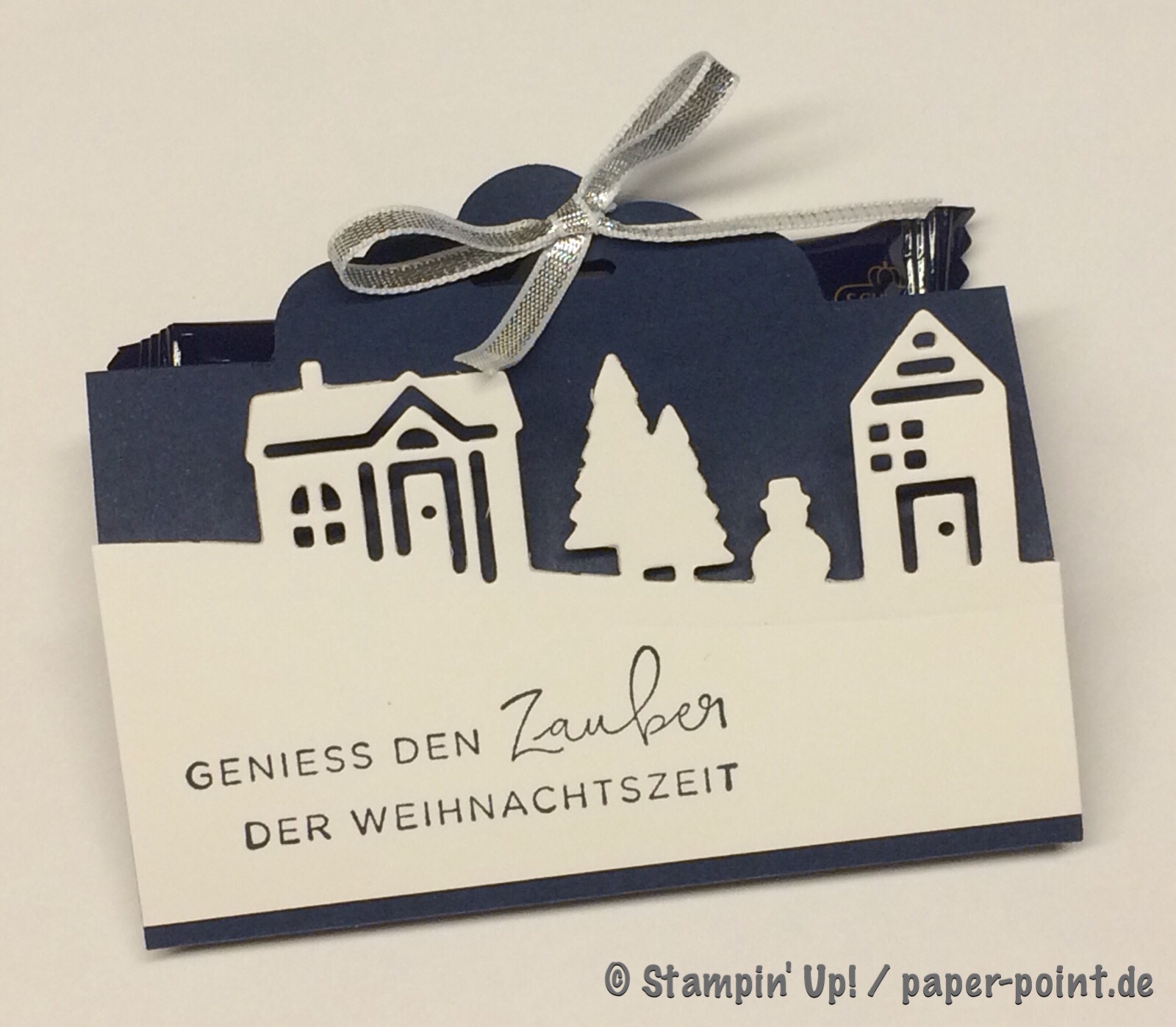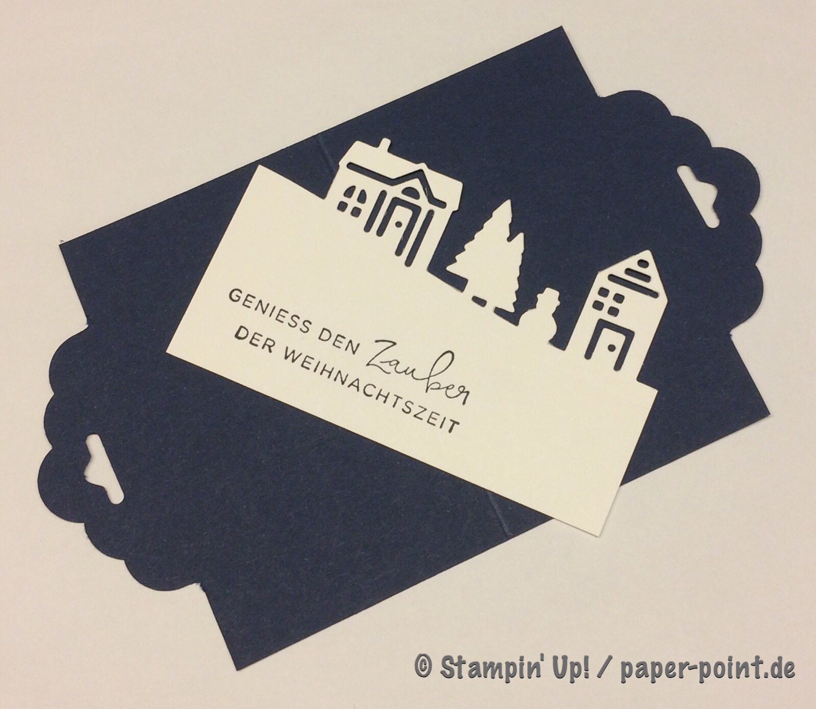 Nun die Karte in der Hälfte zusammenfalten und den zweiten Falz nach innen klappen. Vor dem Festkleben, so dass eine Gutschein- oder Geldtasche entsteht, habe ich mit der 2″ Kreisstanze noch eine Griffmulde gestanzt.