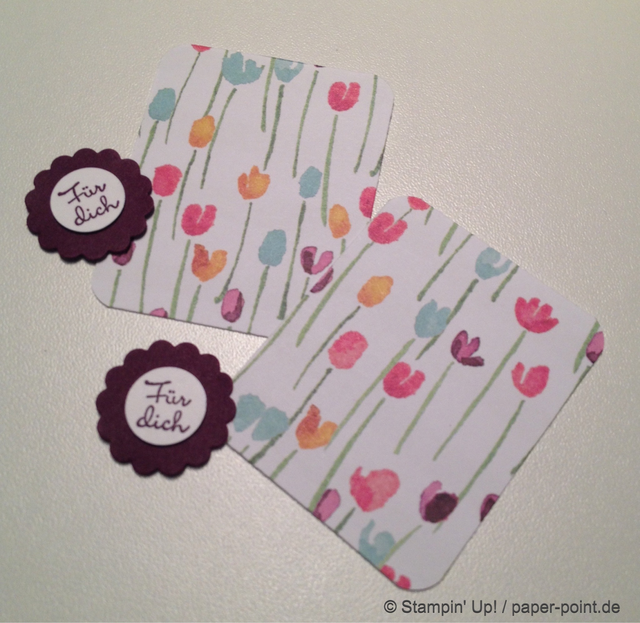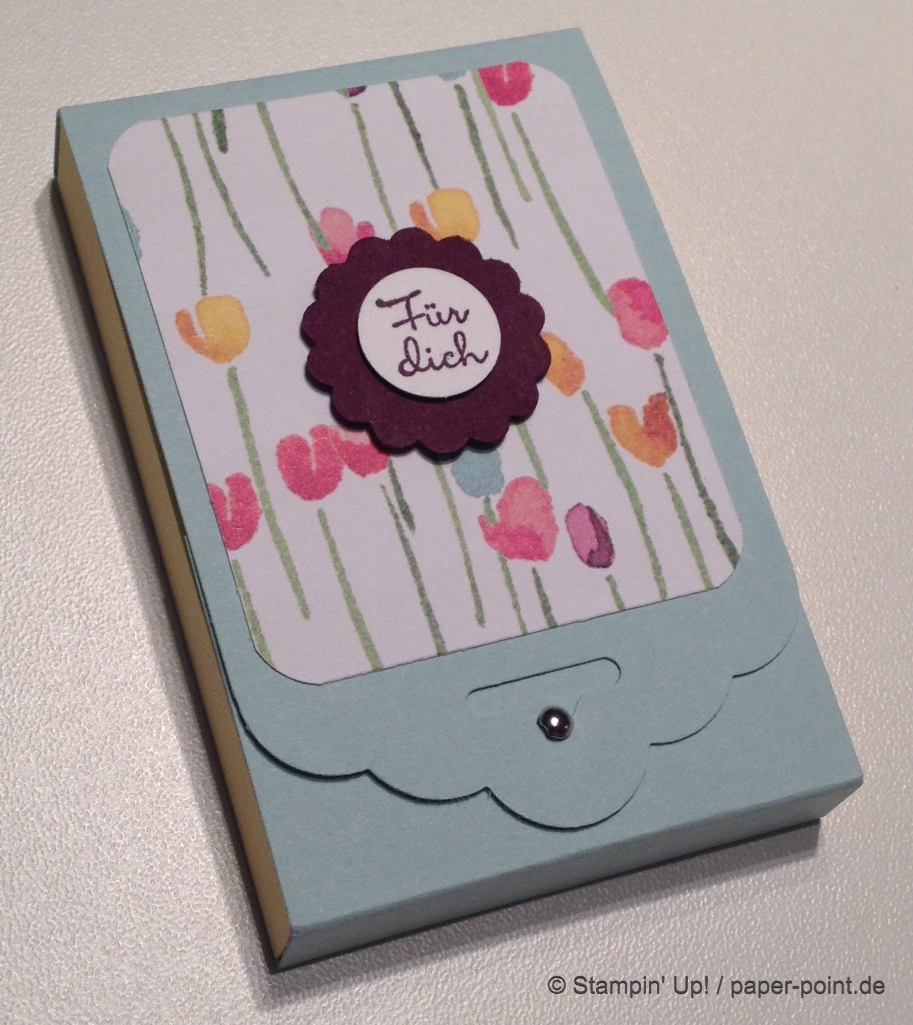 Für das Kärtchen haben wir mit der Stanze „Runder Karteireiter“ eine Ziehlasche ausgestanzt und an der Oberkante angeklebt.