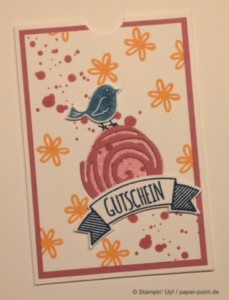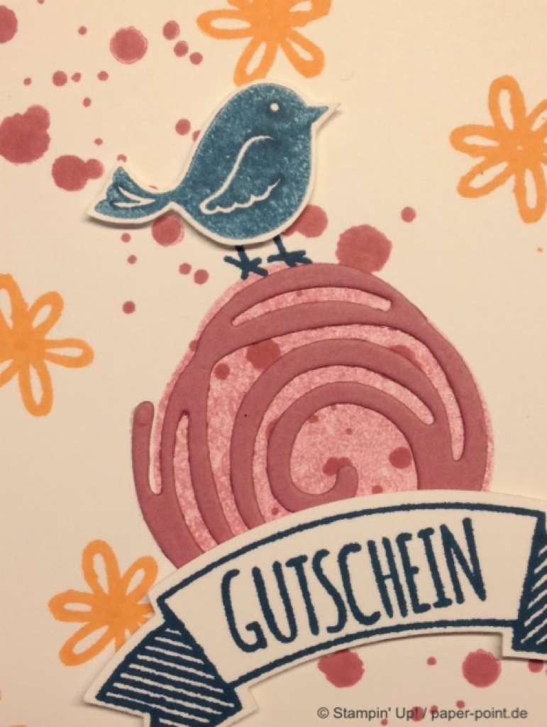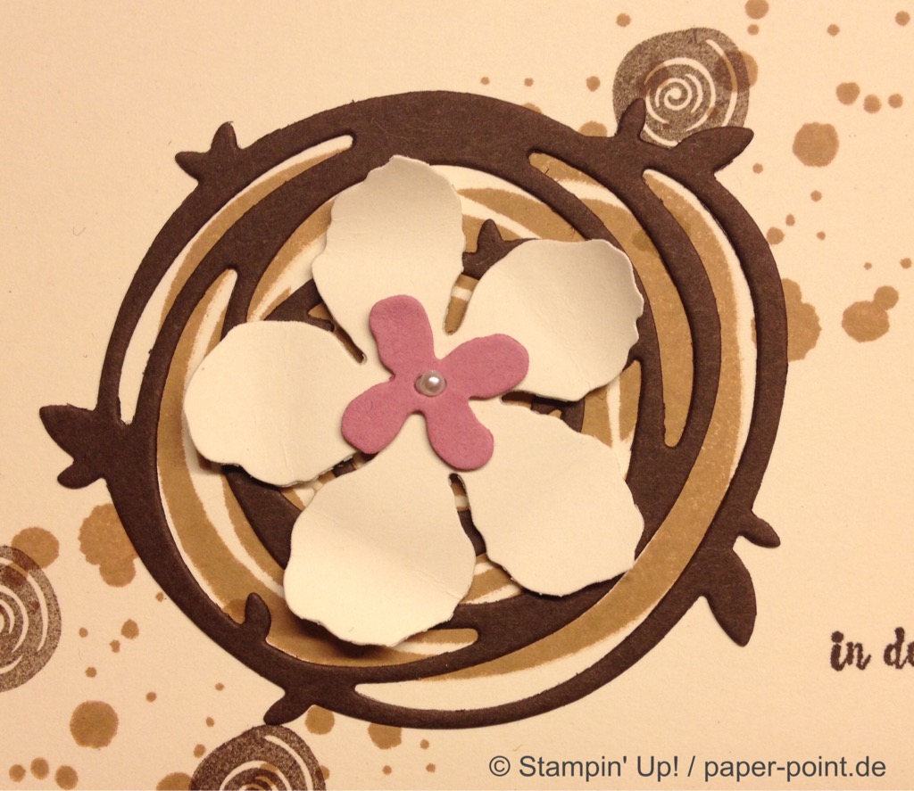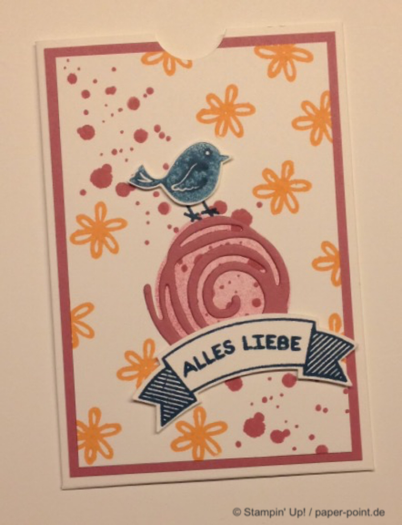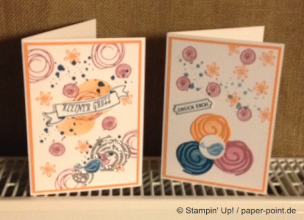 Die orangefarbene Flüssigkeit ist kein Orangensaft, sondern leckeres Aprikosen-Dressing (z.B. für Salat). Hier wurde der Flasche eine Banderole aus dem Designerpapier „Traum vom Meer“ verpasst, auf die wir mit „Swirly Bird“ und „Wunderbar verwickelt“ (JK Seite 159) zwei Aprikosen aufgeklebt haben. Bei der Beschriftung hat uns das Labeler Alphabet (JK Seite 175) gute Dienste geleistet. Auf dem Deckel kleben zwei kleine Kreise und als Topping ein kleines Blümchen.