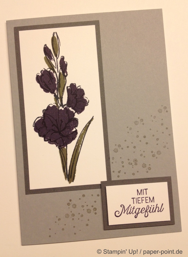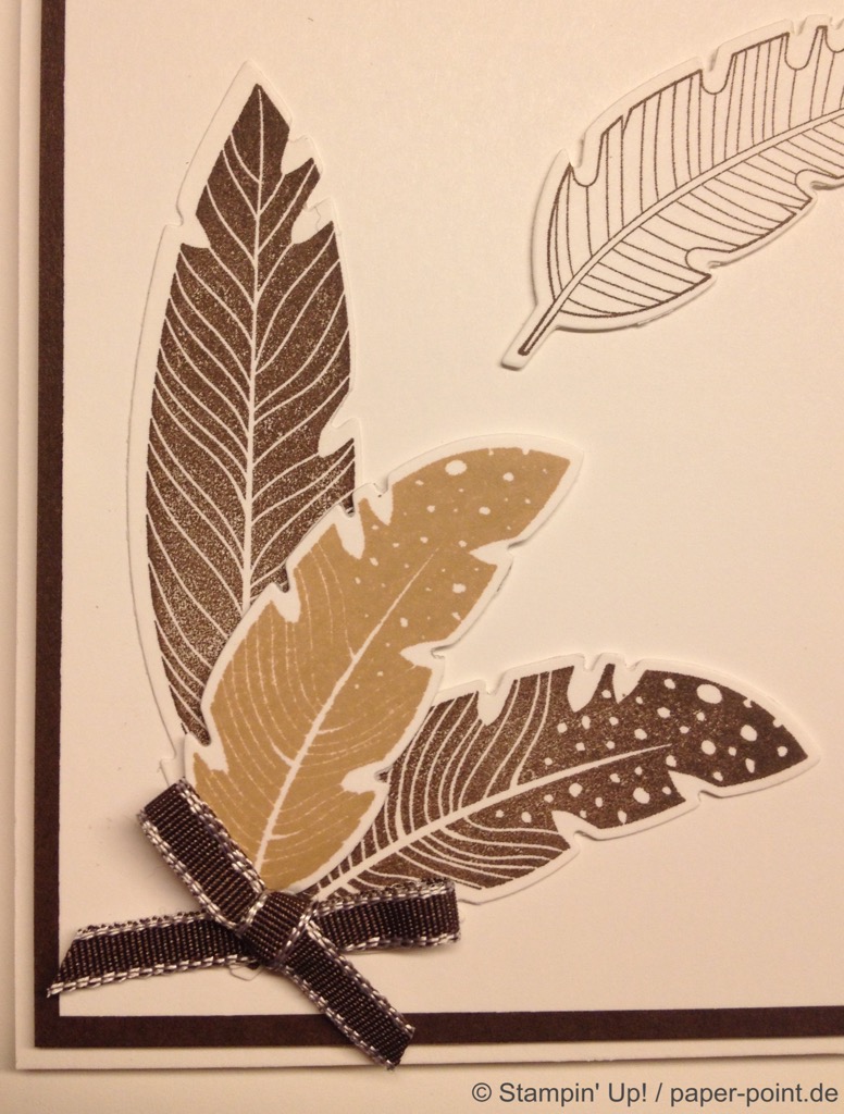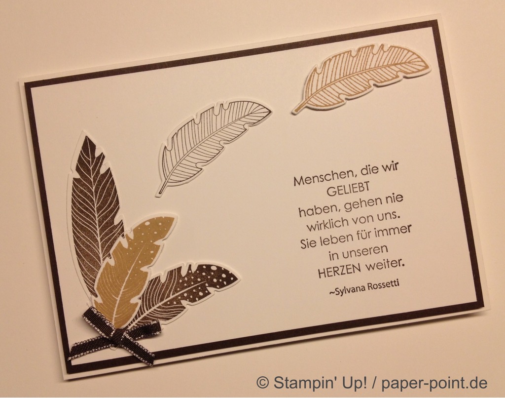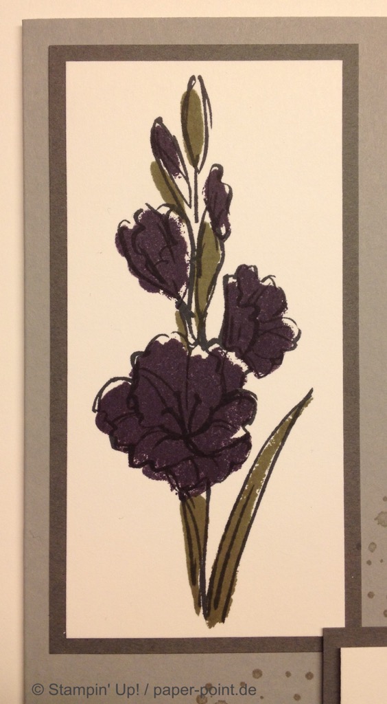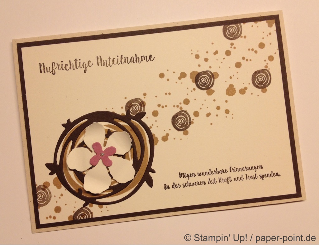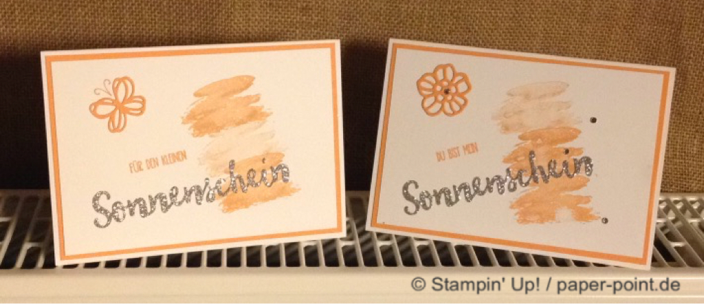 Die orangefarbene Flüssigkeit ist kein Orangensaft, sondern leckeres Aprikosen-Dressing (z.B. für Salat). Hier wurde der Flasche eine Banderole aus dem Designerpapier „Traum vom Meer“ verpasst, auf die wir mit „Swirly Bird“ und „Wunderbar verwickelt“ (JK Seite 159) zwei Aprikosen aufgeklebt haben. Bei der Beschriftung hat uns das Labeler Alphabet (JK Seite 175) gute Dienste geleistet. Auf dem Deckel kleben zwei kleine Kreise und als Topping ein kleines Blümchen.