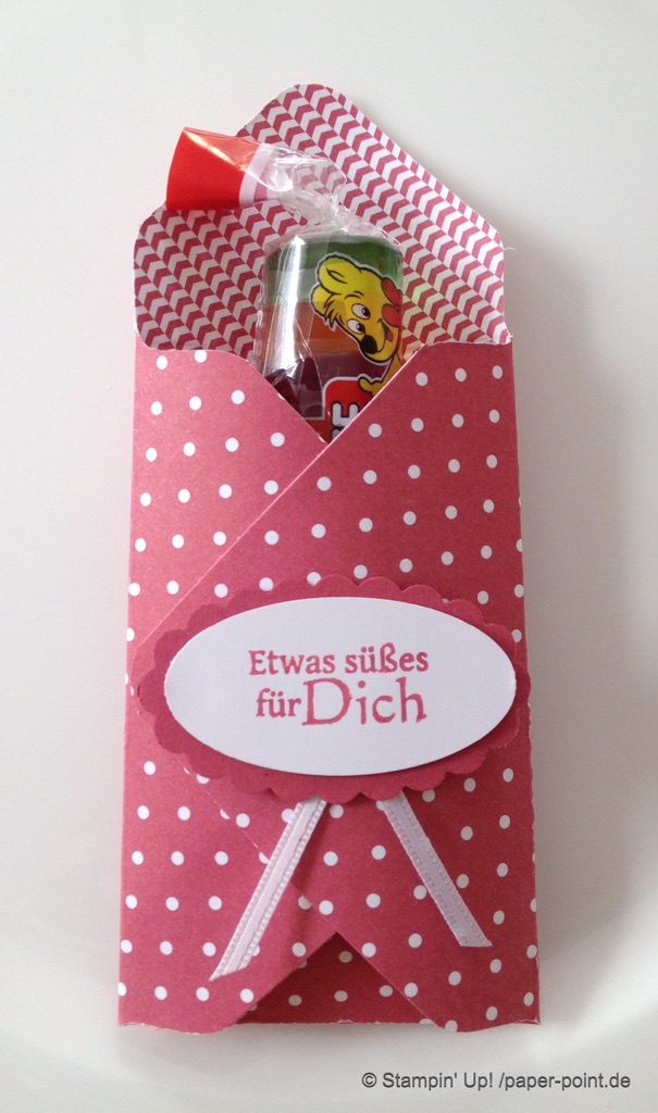 Farbkarton 29,7 x 14,85 cm, gefalzt an der langen Seite bei 4 / 14,4 / 24,9 cm. Die oberen 4,8 cm werden zu einem Dreieck geschnitten. Die untere Lasche wird nach oben geklebt und nur seitlich befestigt, damit man Geld oder Gutscheine darin verschenken kann.