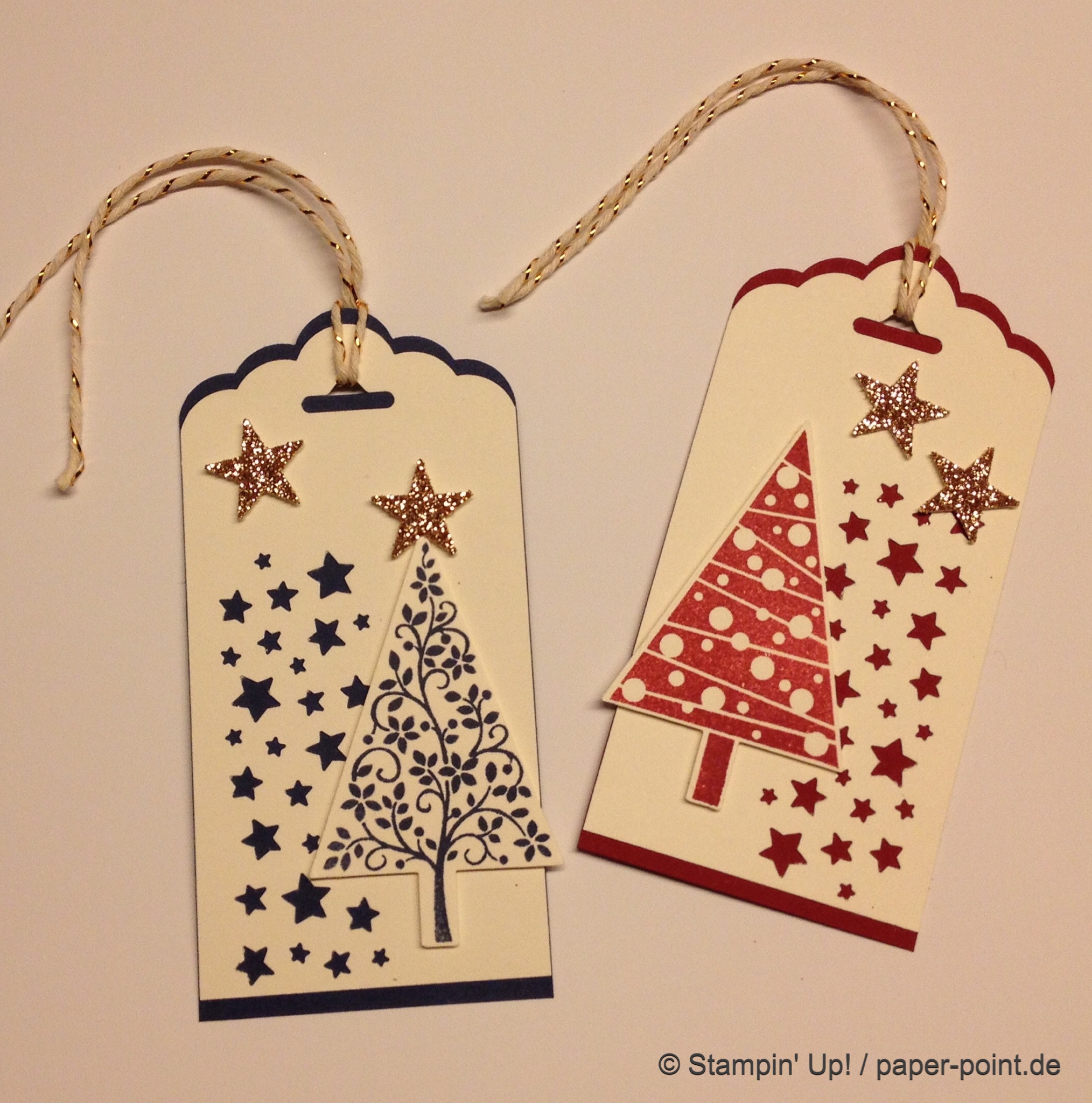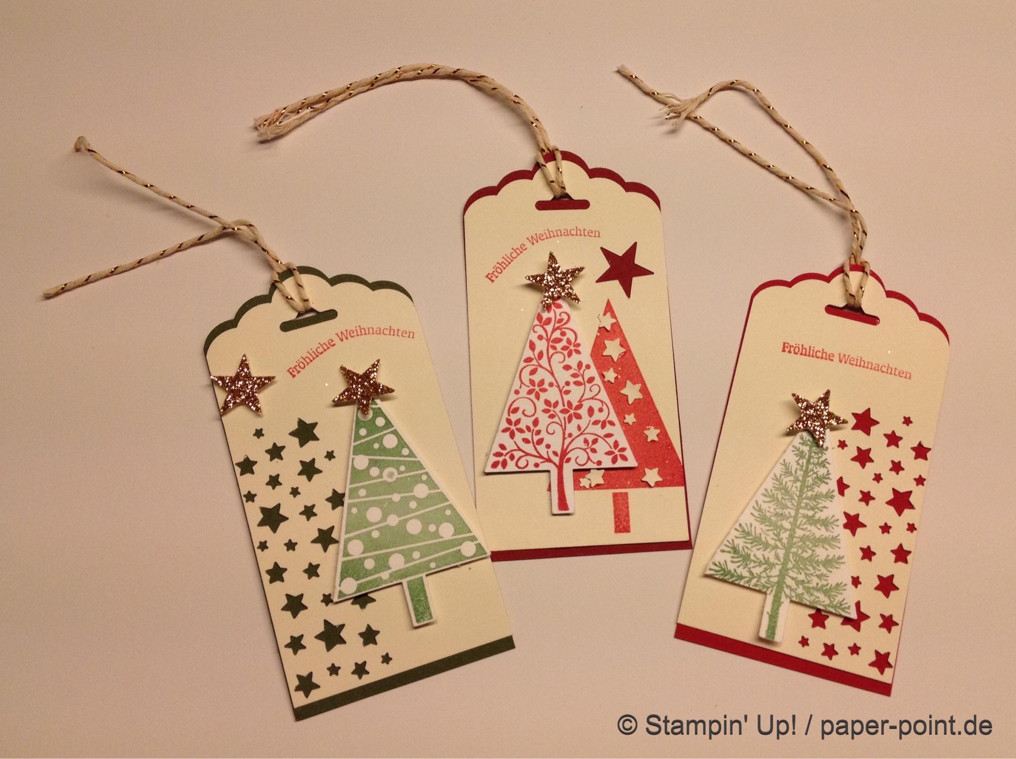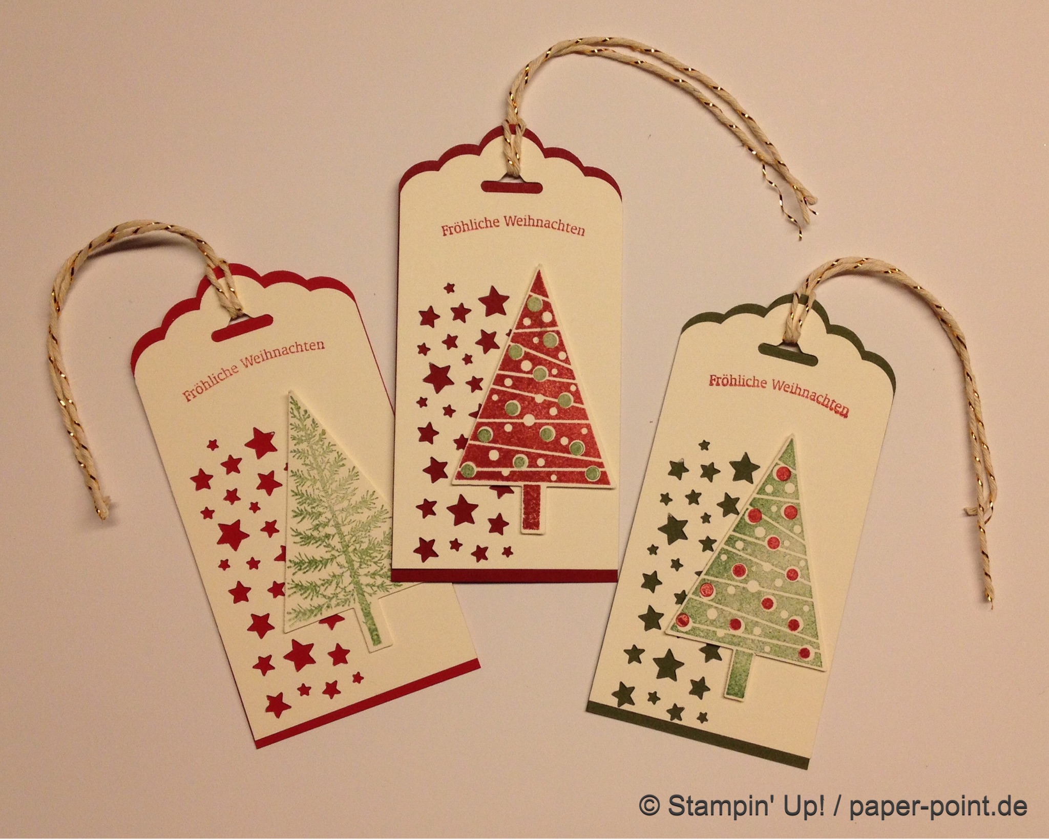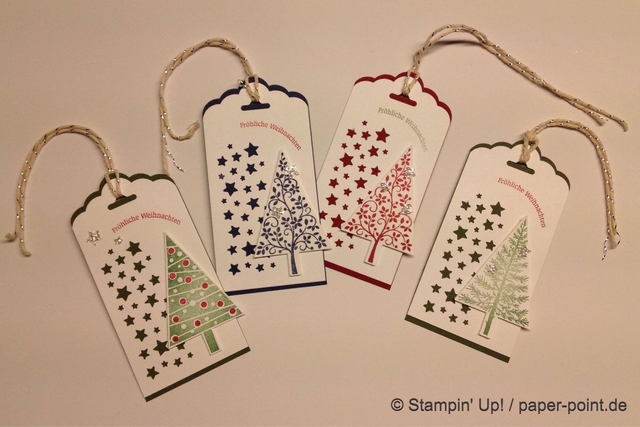 Auf der Vorderseite kleben verschiedene Schilder mit diversen Grüßen, überwiegend mit den Framelits Etikett-Kollektion ausgestanzt. Die meisten haben an ihr Etikett noch ein Fähnchen aus Kordband angeklebt oder festgetackert.