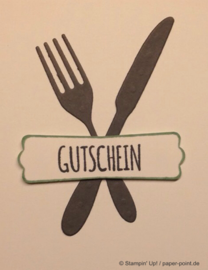 Das Besteck habe ich aus den „Framelits Formen Teestunde“ und wurde mit der BigShot gekurbelt. Darauf ein kleines Gutschein-Schildchen, und jeder weiß schnell, wofür es gedacht ist… 😉 Die weiteren Infos und unsere persönlichen Glückwünsche habe ich dann handschriftlich hinzugefügt.
