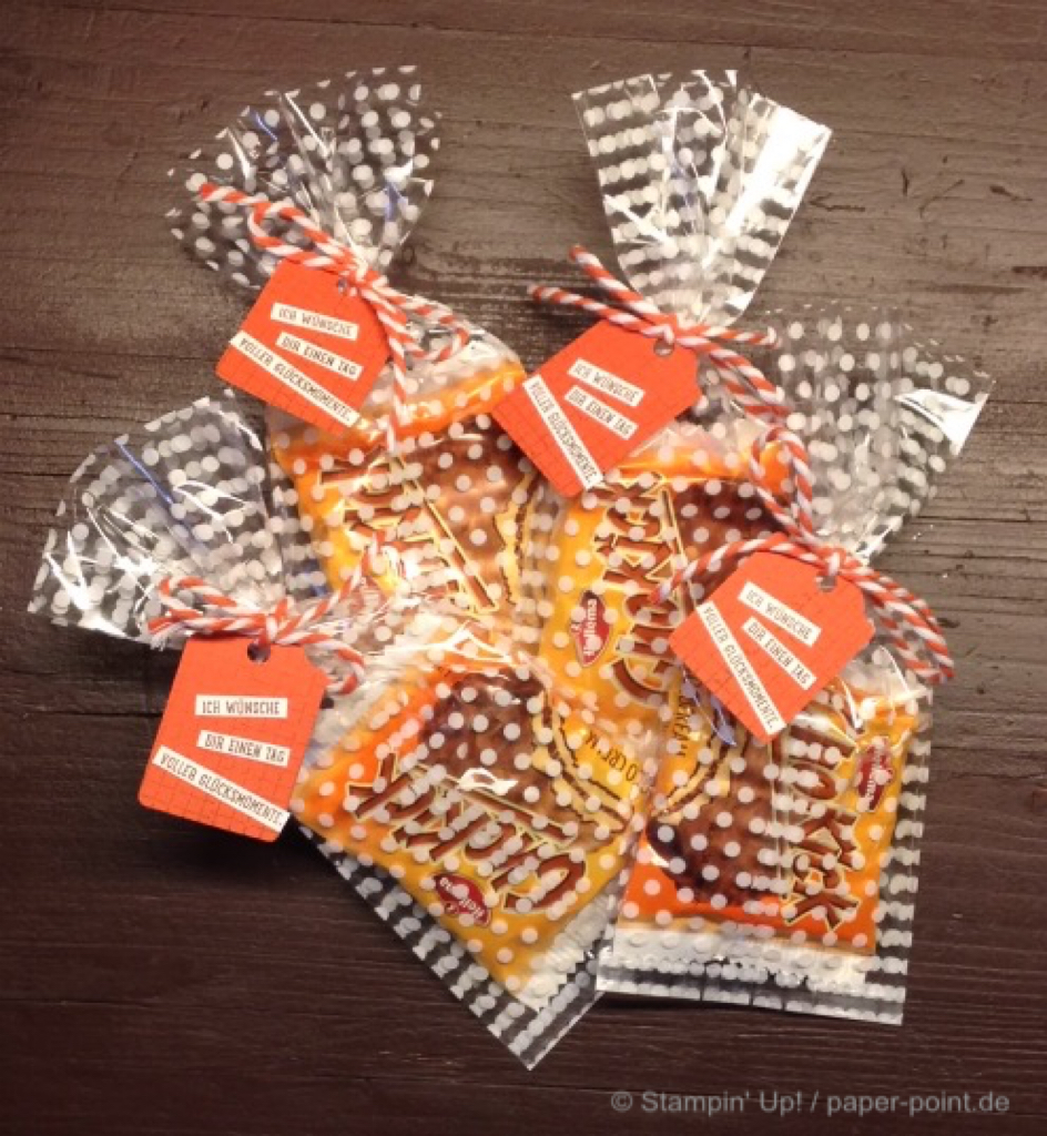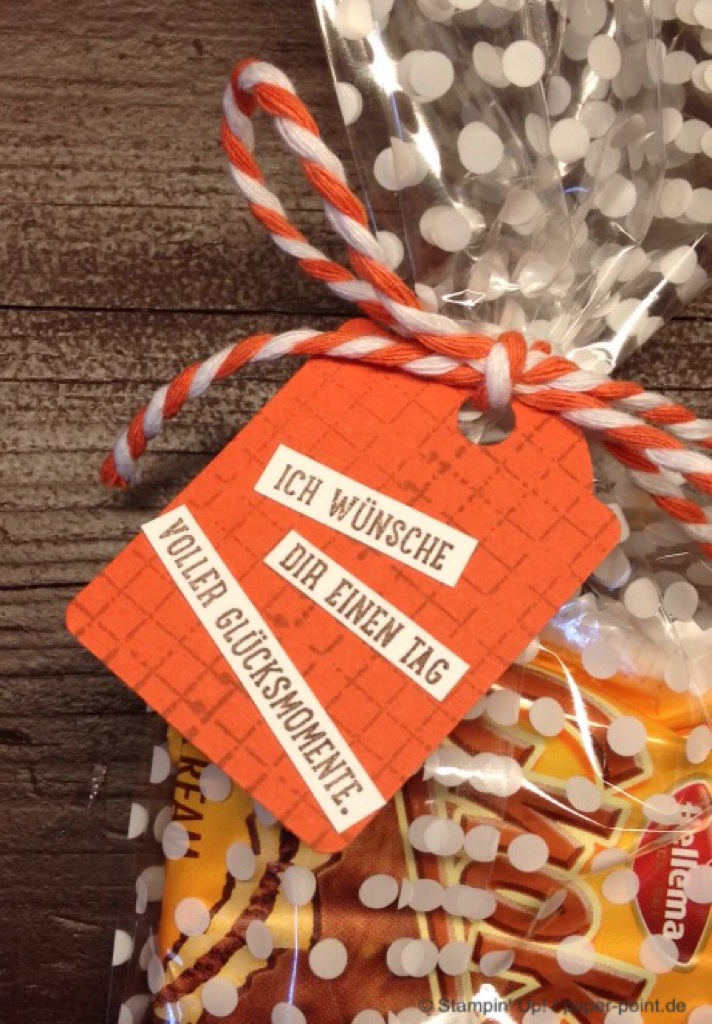 Nachdem ich jeweils ein Schoko-Cookie darin verstaut hatte, habe ich die Tüten mit einem Etikett verziert, dass ich mit dicker gestriefter Kordel festgebunden habe. Das Muster habe ich mit „Timeless Textures“ gestempelt und den Spruch aus „Worte, die gut tun“ habe ich einfach zerschnippelt und aufgeklebt.