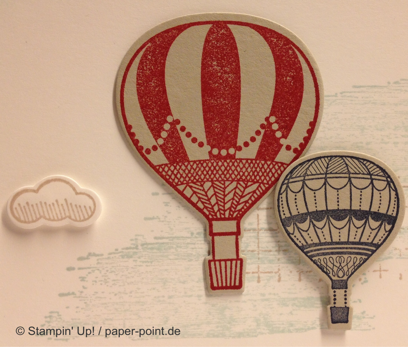 Ein weiteres Mal kamen die Stempel „Abgehoben“ und Stanzformen „In den Wolken“ mit den Heißluftballons zum Einsatz. Man ist von ihnen immer wieder fasziniert und ich kann euch sagen, es ist ein unbeschreibliches Erlebnis, mal selbst damit zu fahren. Das habe ich vor einigen Jahren mal gemacht! Mega genial! 😍