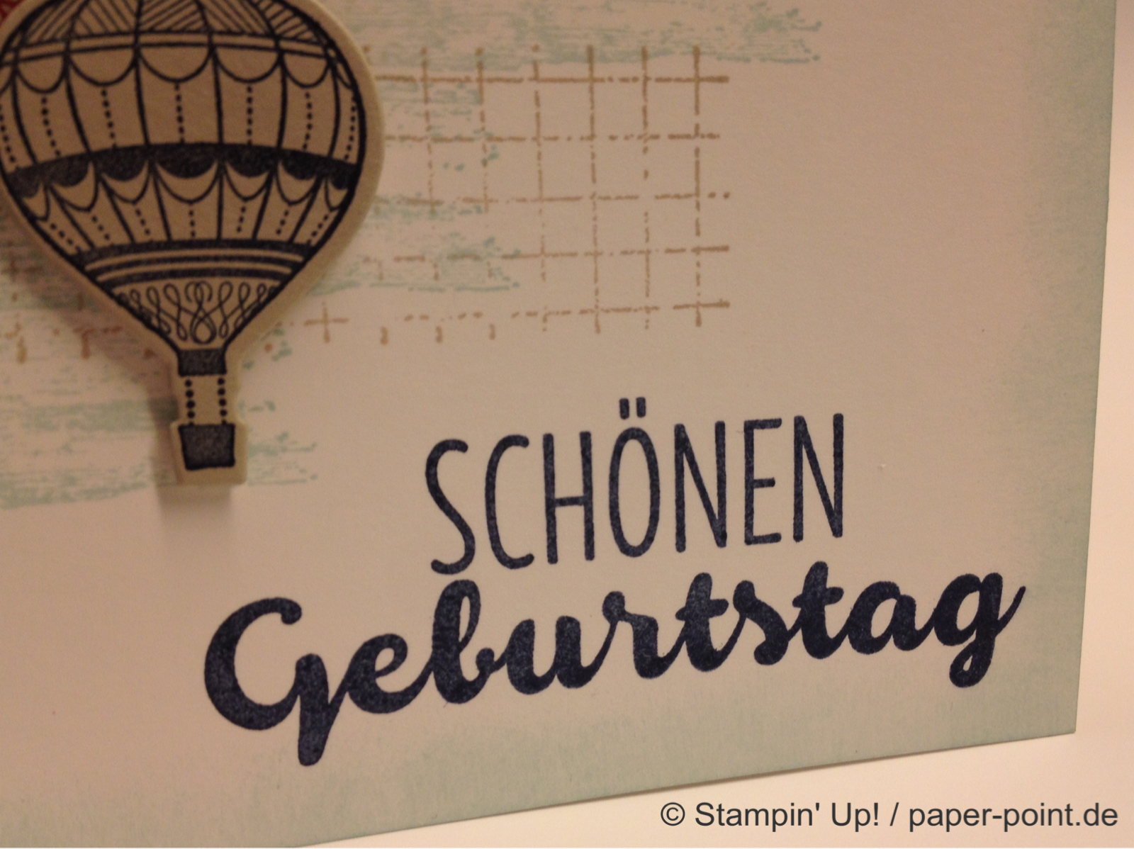 Den Rand habe ich mit einem Stempel aus „Timeless Textures“ eingefärbt. Das Ganze wurde dann auf einen Hintergrund in Minzmakrone, passend zu den Luftballons geklebt und dann auf eine weiße Grundkarte in C6.
