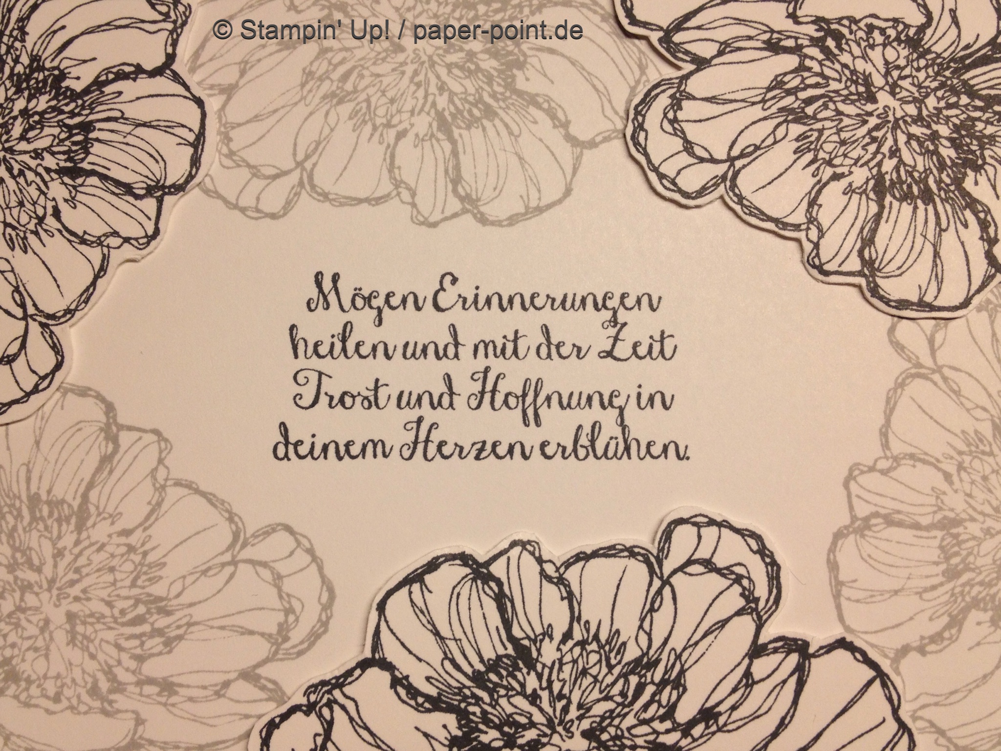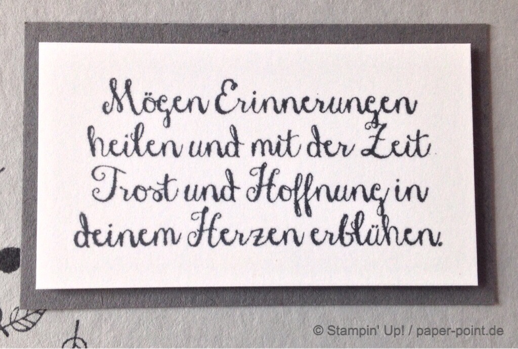 Auch die „Timeless Textures“ kann man gut für Trauerkarten verwenden. Das Spruch-Etikett haben wir mit dem Set „Rosenzauber“ gestempelt und mit dem passenden Rahmen zurecht gestanzt mit der BigShot.