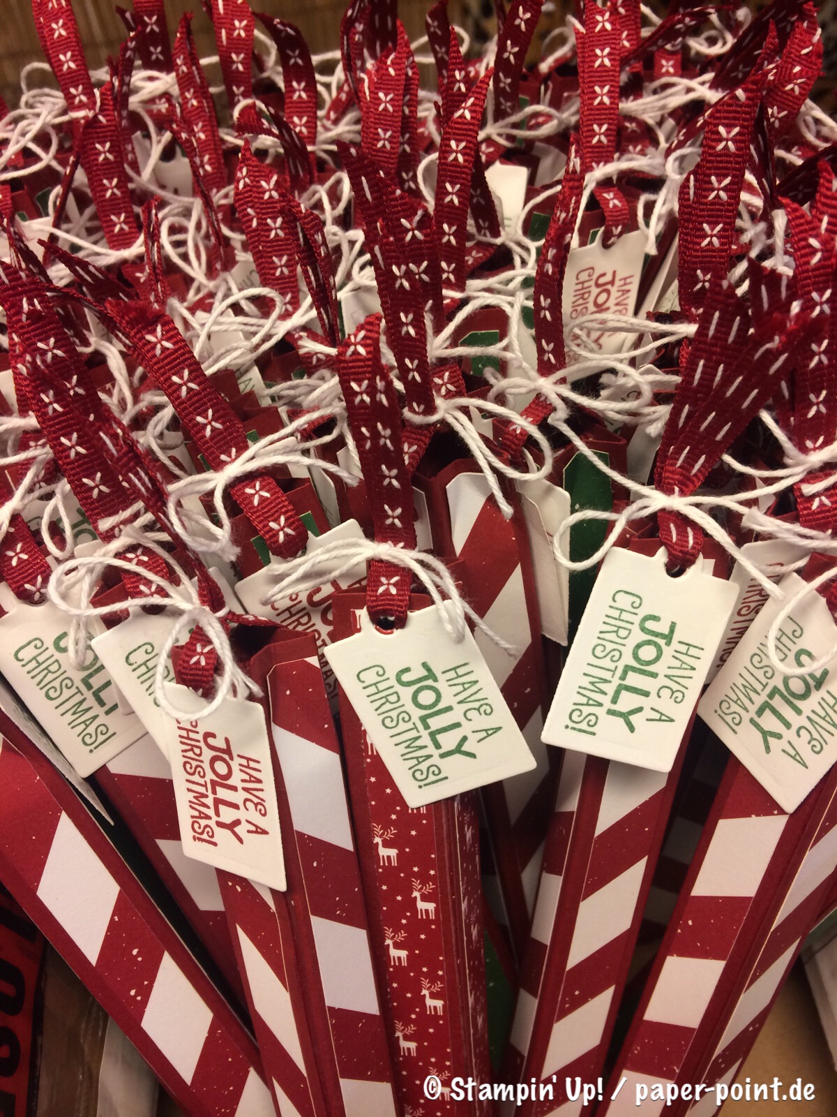 Lebkuchenmännchen in Schokobraun und Schleife in Glutrot auf Flüsterweiß stempeln und mit der Elementstanze „Lebkuchenmännchen“ ausstanzen