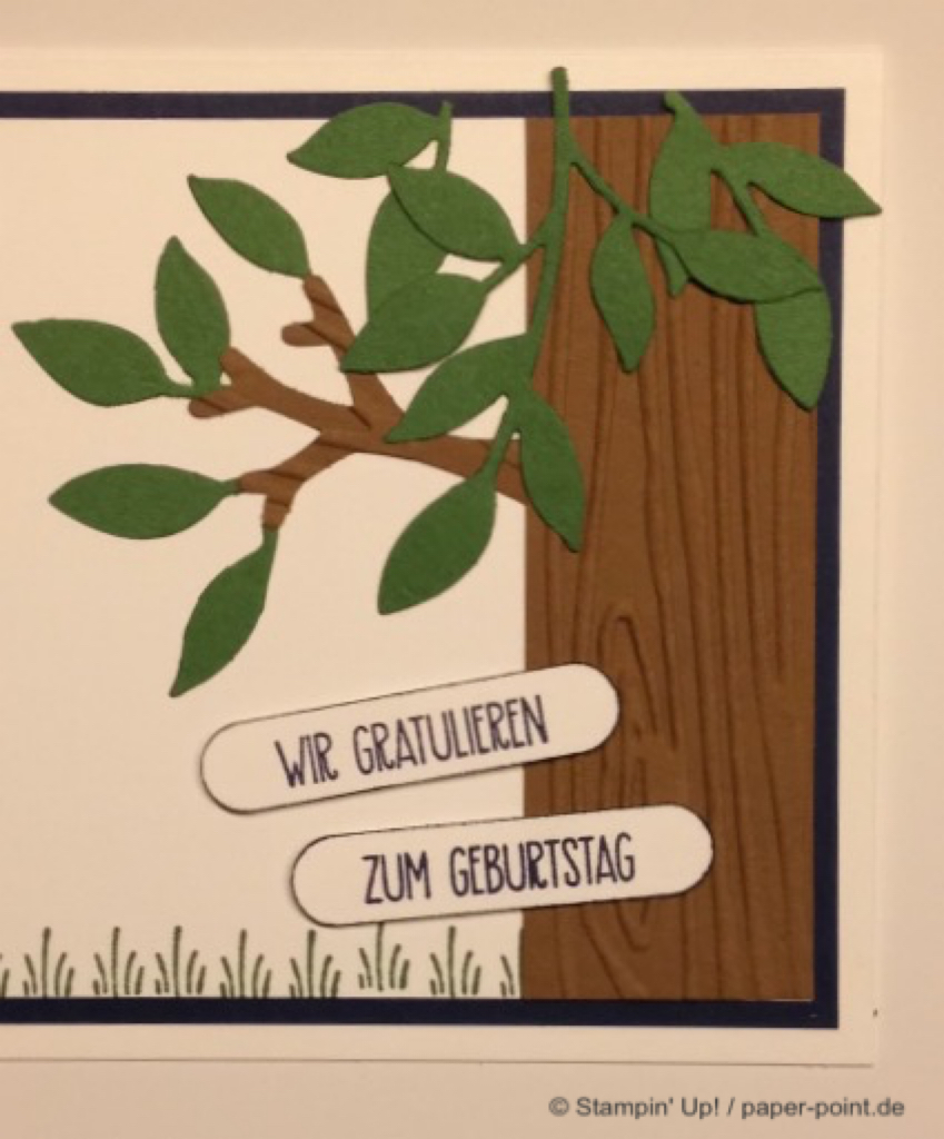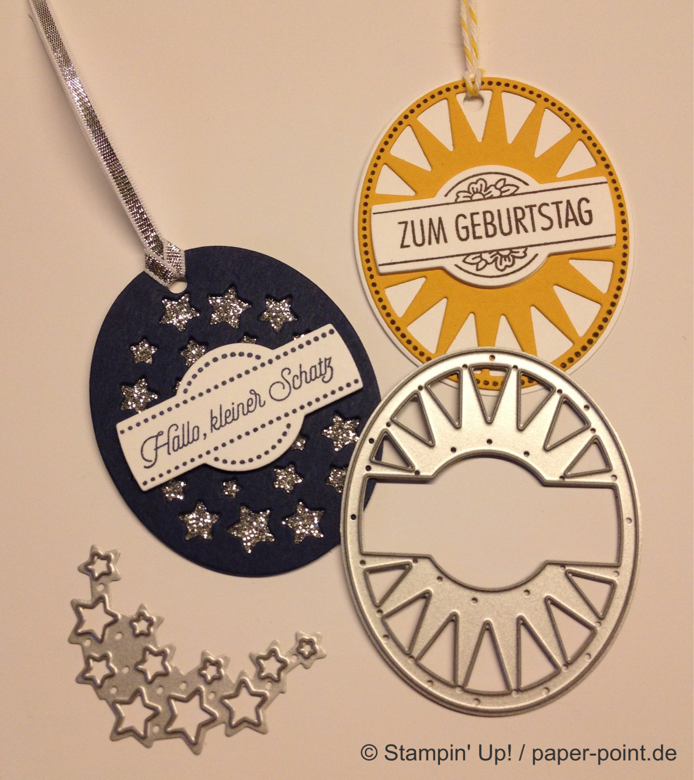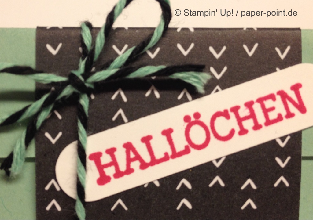 Die Texte sind im Stempelset enthalten und mit dem Wortfenster (alte Stanze) sowie dem 7/8″ Wellenkreis (ebenfalls nicht mehr erhältlich) ausgestanzt. Dahinter befindet sich ein Klassisches Etikett bzw. ein 1″ Kreis aus farbigem Karton.