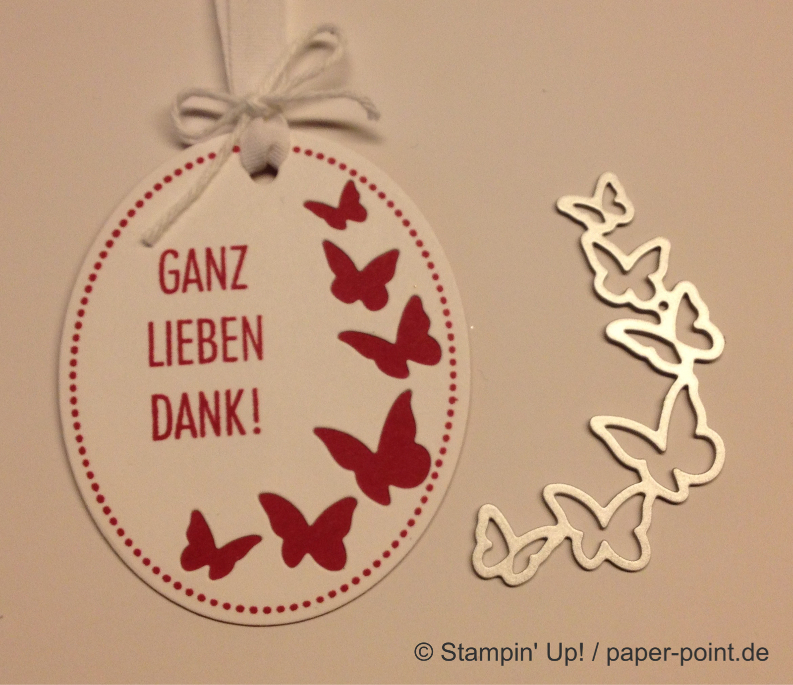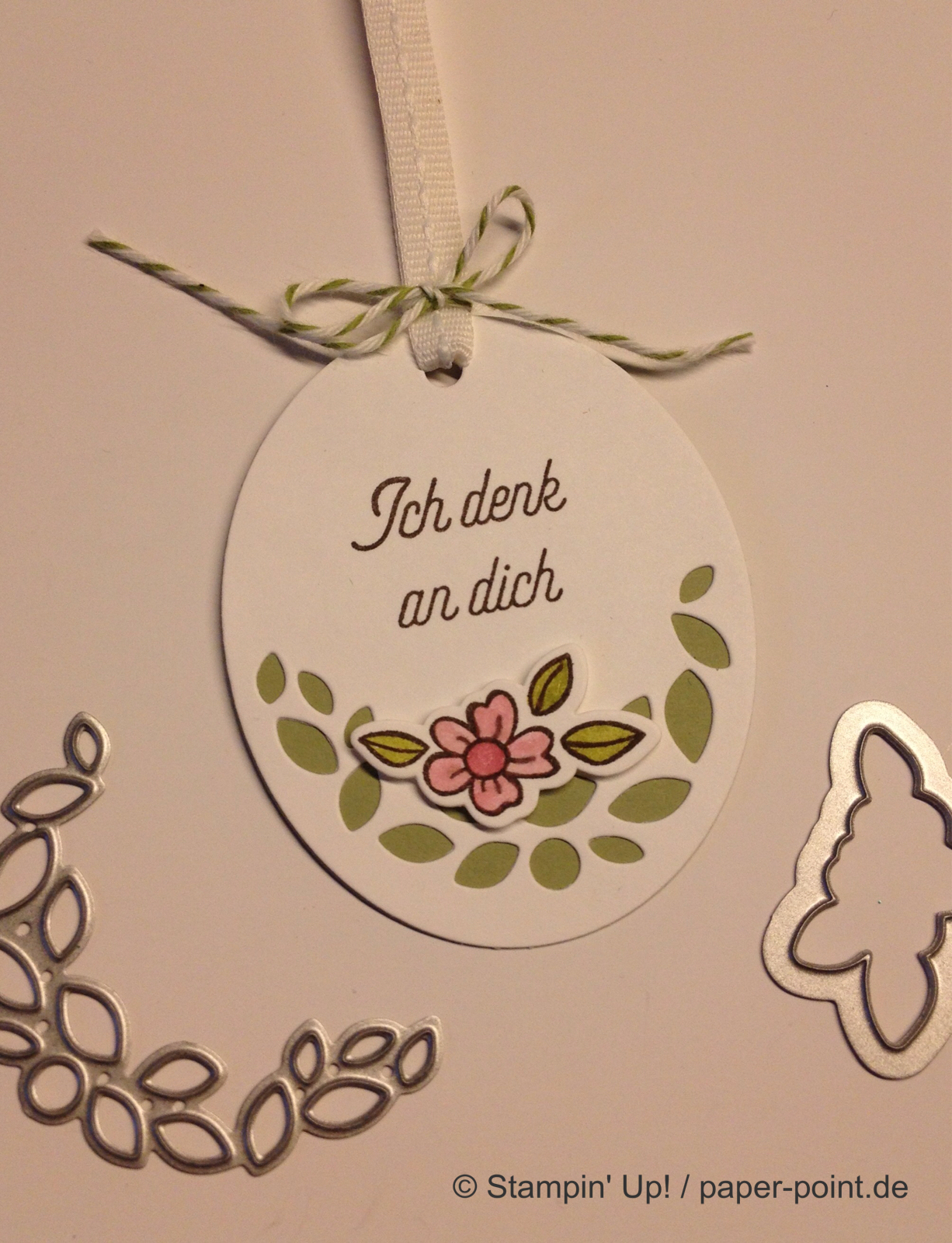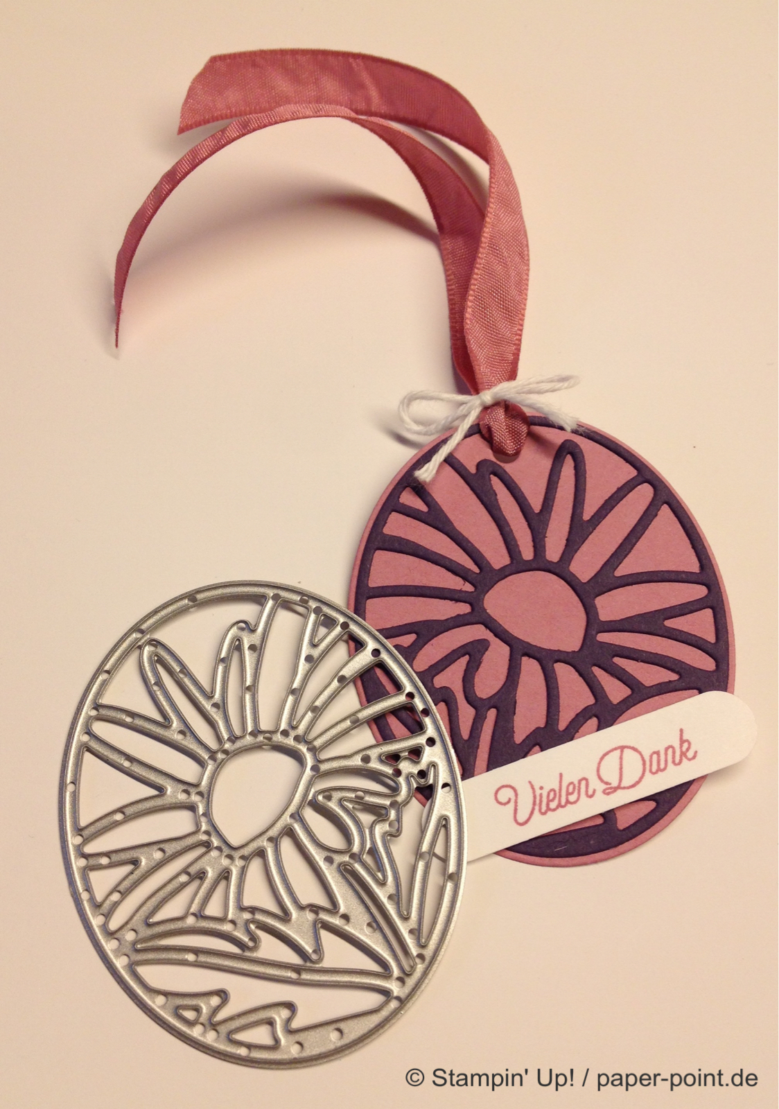 Die Texte sind im Stempelset enthalten und mit dem Wortfenster (alte Stanze) sowie dem 7/8″ Wellenkreis (ebenfalls nicht mehr erhältlich) ausgestanzt. Dahinter befindet sich ein Klassisches Etikett bzw. ein 1″ Kreis aus farbigem Karton.